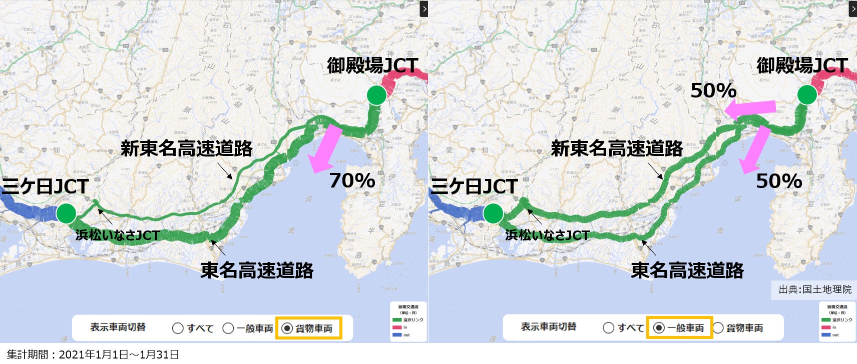 これらのことから一般車両では新東名高速道路を選択しやすくなったと推測されます。
