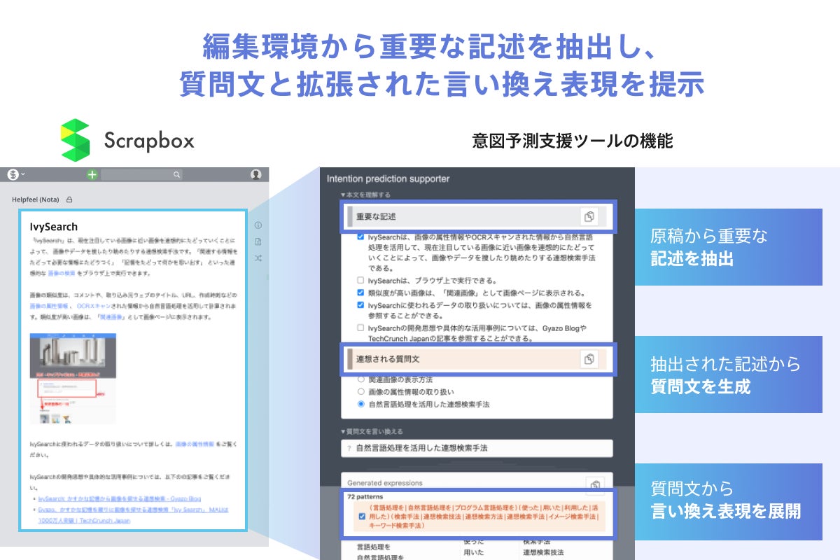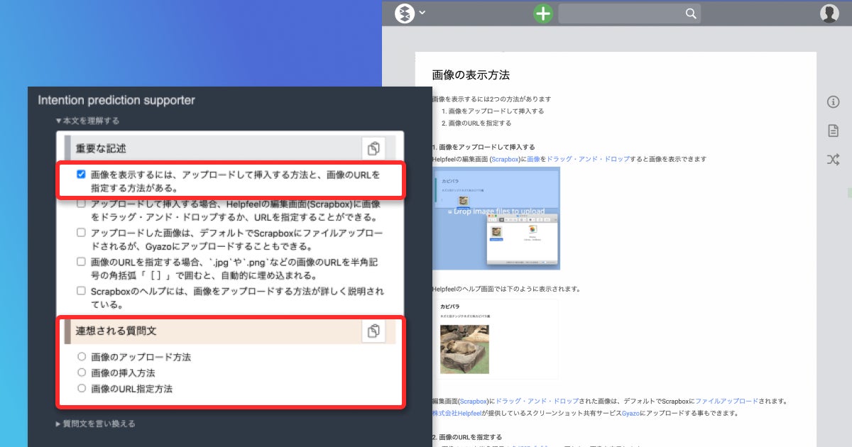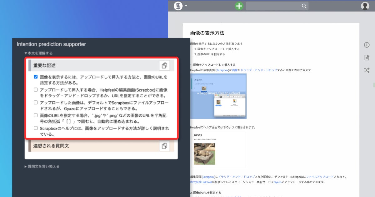 本機能は編集環境となるScrapboxのエディタからすぐに起動できます。使用すると、質問文の素となる原稿から重要な記述を抜き出して要点を端的にまとめて提示します。難解な内容であっても要点が端的にまとめられるため、効率よく情報を把握して理解することができます。本機能によりライターはクリエイティブな発想と作文に時間を使うことができるようになります。