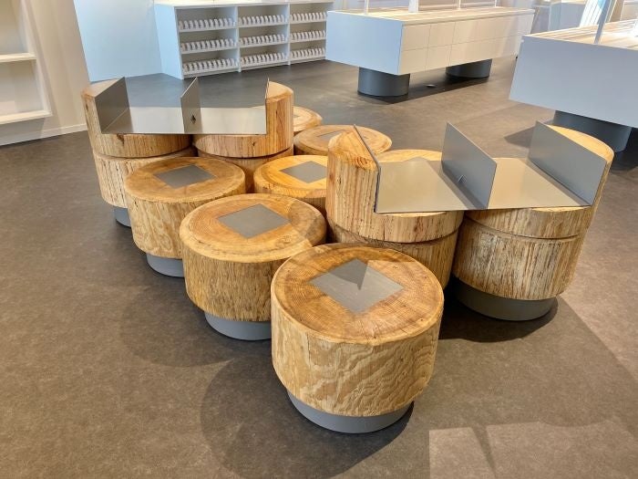 店舗設計は建築家の平居直⽒が担当しました。店内の待合スペースのスツールや本棚には、岸和⽥だんじり祭で実際に使⽤した、だんじりの⾞輪を再利⽤。⾞輪の形状はそのままに、集積して形成したスツールや本棚は、趣を残しつつも店内でひときわ存在感を放ちます。街の歴史をつくってきた⼀部が、新たに店舗の⼀部として空間を彩ります。また、店内には岸和⽥だんじり祭に関する書籍など約350冊を陳列し、街の歴史に触れることができる場所を⽬指しました。