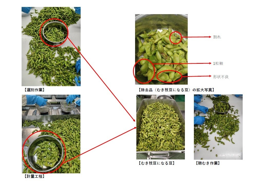 ● 「黒枝豆のビーフン ペペロンチーノ風」に使用している黒枝豆は、製造過程の選別や計量行程の中で、割れたり形状が悪かったりして、冷凍商品の「丹波黒枝豆」にはできない、規格外品となったものを使用しています。見た目や味としては何も変わらないので、フードロスを減らしたいと考え開発に至りました。