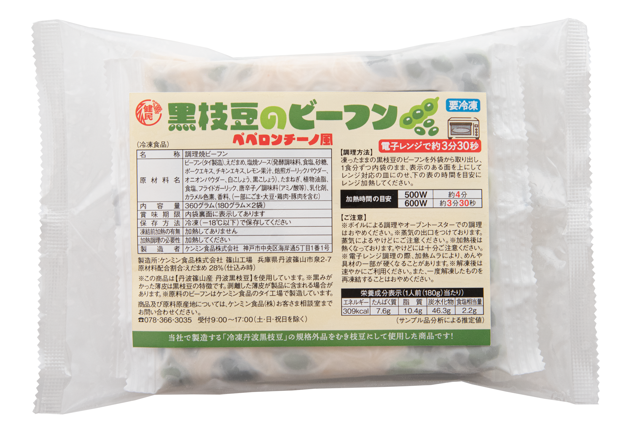 ●弊社は、地産地消・地域活性化に貢献すべく、これまで「神戸牛焼ビーフン」(摂津)、赤穂の天塩(播磨)を使用した「8種野菜の焼ビーフン」、淡路の玉葱(淡路)を使った「兵庫ケンミン焼ビーフン」といった兵庫五国の食材を生かした冷凍ビーフンを開発しています。今回、丹波エリアの特産品である丹波黒枝豆を使用し、「黒枝豆のビーフン ペペロンチーノ風」を販売します。