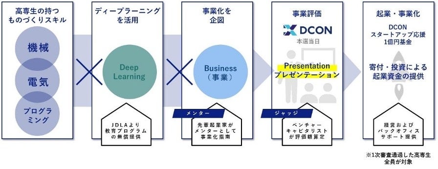 全国高等専門学校ディープラーニングコンテスト(DCON)は、高等専門学校の学生が日頃培っている「ものづくりの技術」と「ディープラーニング」を活用して社会課題を解決する作品を制作し、生み出される「事業性」を企業評価額で競うコンテストです。地域社会の課題解決に取り組む高専生ならではの発想力・技術力を生かした、多様で新規性の高い作品の応募が多数寄せられ、例年複数チームが本コンテスト出場後に実際の事業創出に挑戦しています。DCONは未来のものづくりリーダーを発掘し、技術活用・事業創出を促進する機会をつくり、全国の高専生が持つ可能性を支援し続けています。
