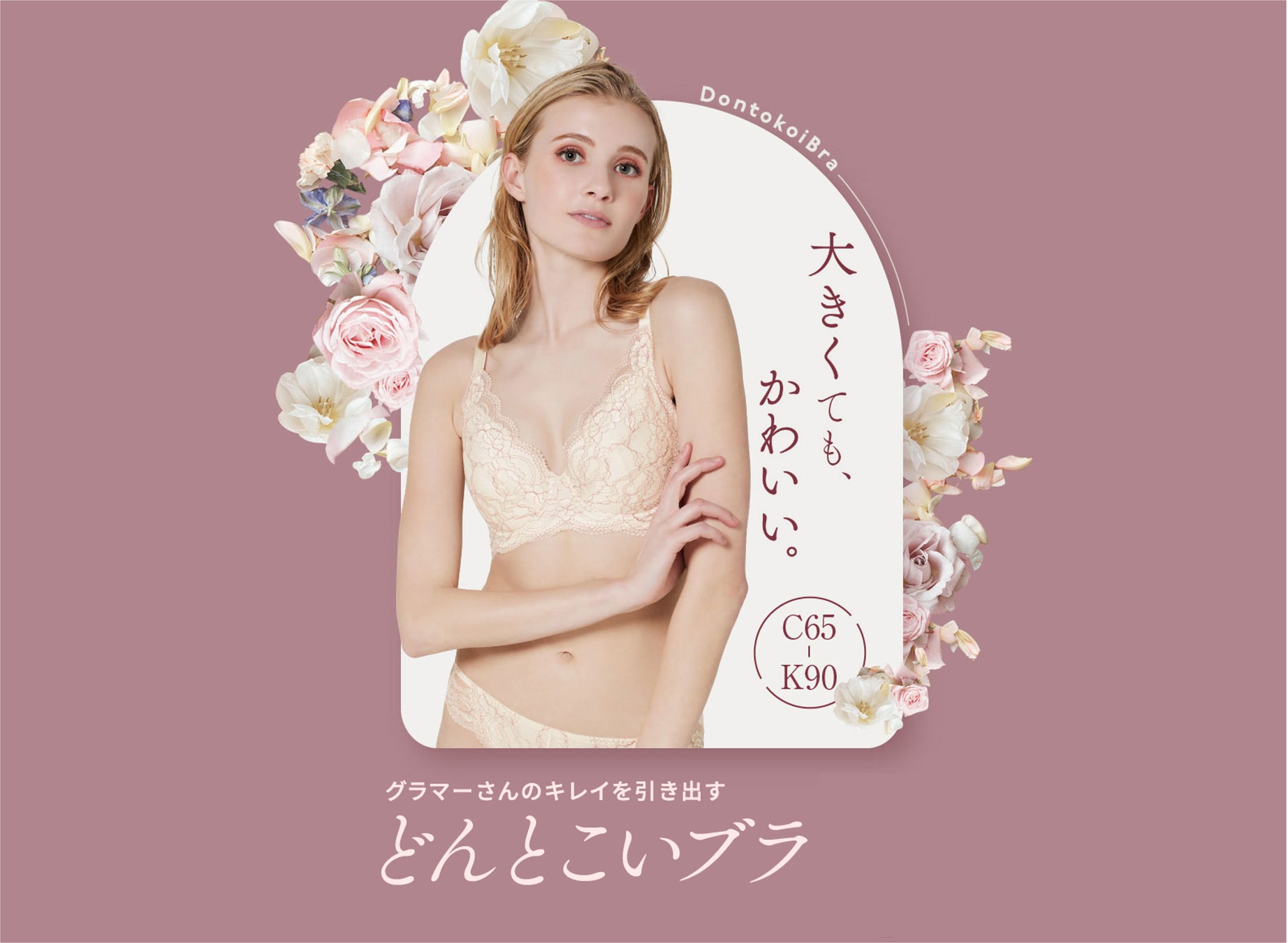 バスト広がって見えてしまったり、バストを支えきれなかったり、そもそもサイズがなかったりと、グラマーさんはブラ選びのお悩みが尽きません。「どんとこいブラ」はそんな悩みを解消する大人気ブラジャーです。