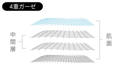 特許出願中の独自4層構造ガーゼ素材を採用。肌に触れる面は表も裏も綿素材にすることで、肌への直接的な刺激を低減しました*。敏感肌の方や、化学繊維に抵抗がある方にも着用いただけます。