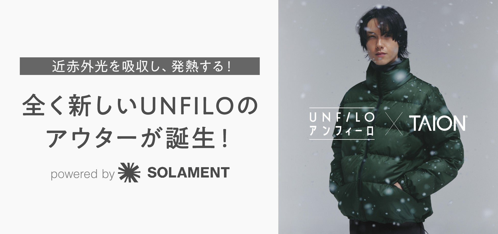 『UNFILO』は、これまでに、インナーダウンウェアブランド「TAION(タイオン)」とコラボレーションし、"軽くて暖かい機能性"と"自社パターンによる美しいフォルム"のアウターを開発し、シリーズ累計5万枚以上を販売するヒット商品を生み出してきました。その技術をさらに進化させ、太陽光に含まれる近赤外線を吸収して発熱する素材「SOLAMENT®(ソラメント)」を採用し、暖かく、軽く、美しい新アウターの開発にいたりました。
