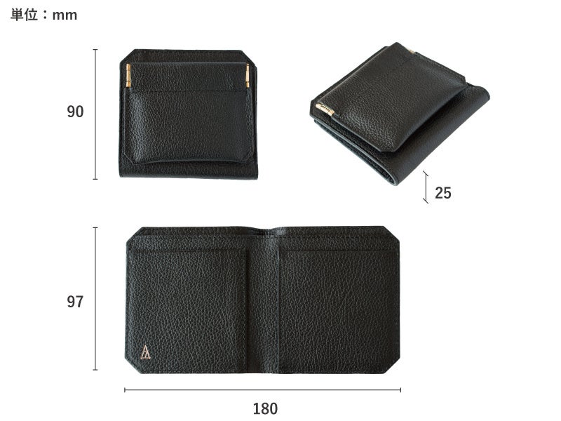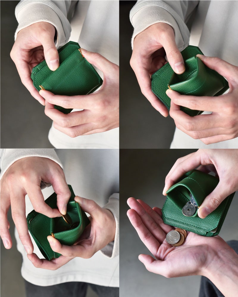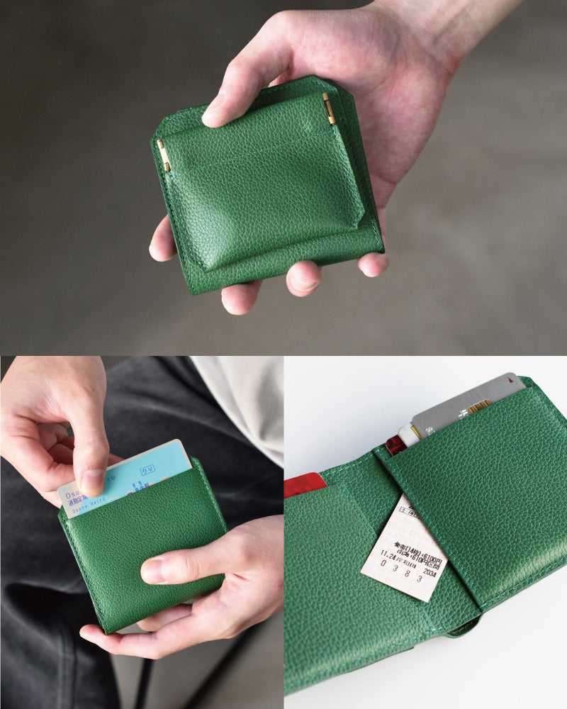 小銭入れは収納の少ないときに薄く収まるバネ口を採用。背面ポケットを1つ設け、ICカードなどをスムーズにご使用いただけます。内側の片面にも小物を入れることができるポケットをつけることで、なくしもの防止タグや切符などを入れるのにオススメです。