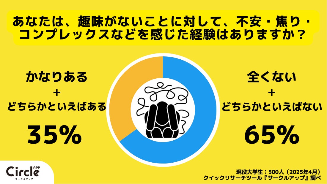 最後に、「趣味がないことに対して、不安・焦り・コンプレックスなどを感じた経験はあるか」質問したところ、現役大学生の35%が「ある」、65%が「ない」と回答しました。