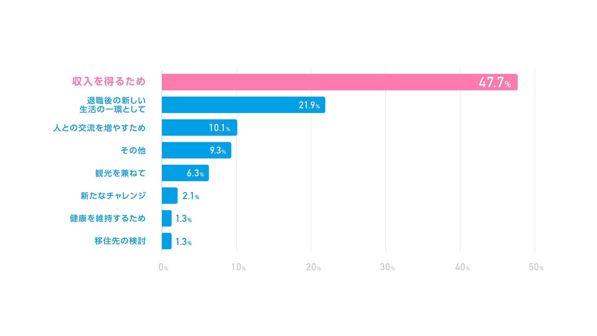 前述の「リゾートバイトを始めた理由」では、「生活費を補うため」という理由も上位に挙げられていたものの、最も多い理由ではありませんでした。しかし、リゾートバイトの目的について調査をしたところ「収入を得るため」(47.7%)が最も多い回答となりました。この結果は、年金や退職金があっても日常的な生活費を補う必要があるほか、将来の医療費や予期せぬ出費に備えるために収入を確保したいというニーズが背景にあると考えられます。