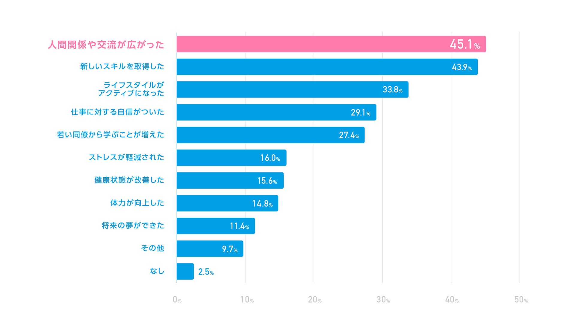 リゾートバイトを始めてからどのような変化があったのか調査をした結果、「人間関係や交流が広がった」(45.1%)が最も多い回答となりました。これは、リゾートバイトを通じて多様なバックグラウンドを持つ人々との交流が増え、社会的なつながりが広がったことを反映しています。次いで「新しいスキルを取得した」(43.9%)「ライフスタイルがアクティブになった」(33.8%)といった回答が続き、ポジティブな変化をもたらしていることがわかります。さらに、リゾートバイトでは幅広い年齢層のスタッフが働いていることから、「若い同僚から学ぶことが増えた」(27.4%)という声も寄せられました。これにより、シニア層の就業者が若年層との交流を通じて新しい視点やスキルを吸収する機会となり、仕事を通じた自己成長が促進されていることがうかがえます。