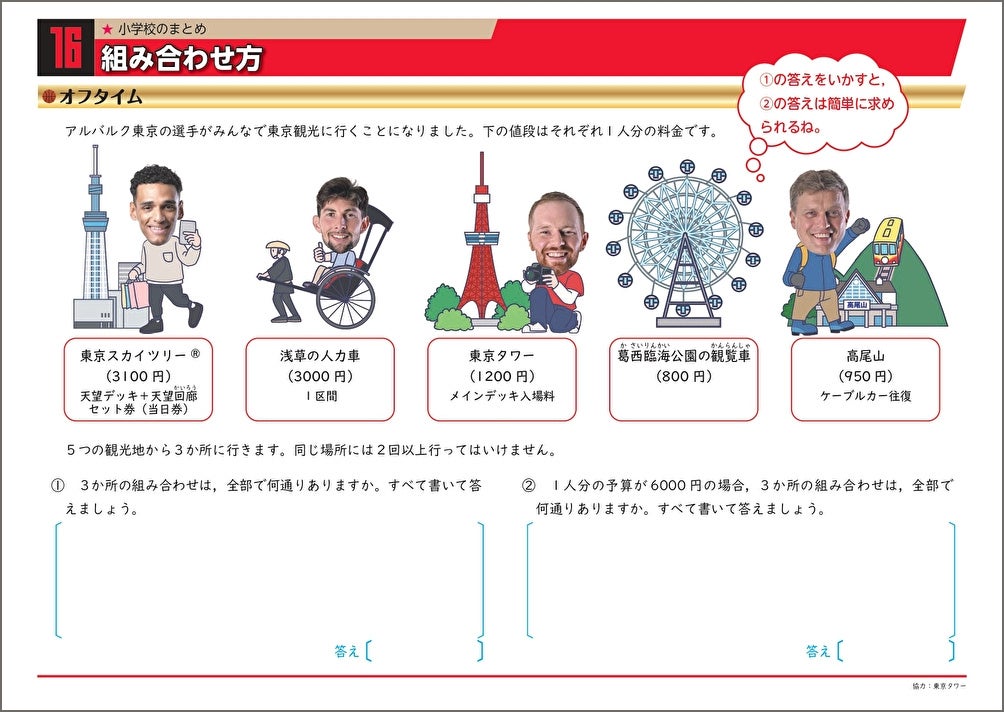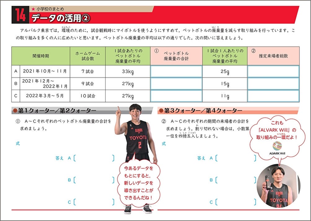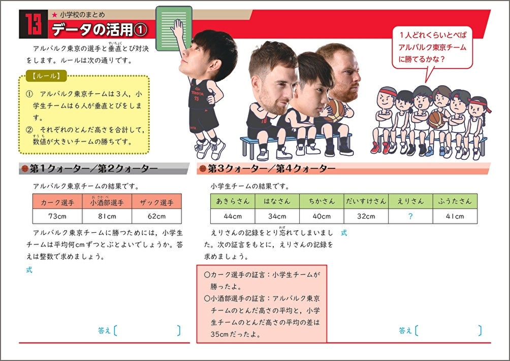 このドリルは、スポーツの魅力を感じながら子供たちが楽しく算数を学ぶことができるように、バスケットボールやアルバルク東京の選手・チアリーダー・マスコットに関連した問題で構成されています。
