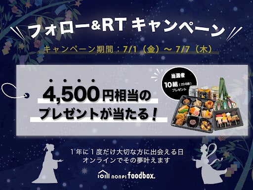 日本全国に料理と飲み物を1箱にしたフードボックス”をお届けする『nonpi foodbox™』を展開する株式会社ノンピ(本社:東京都千代田区、代表取締役社長 :柿沼寛之)は、2022年7月1日(金)~7月7日(木)の期間中、「神田明神下みやび 江戸の味プラン 4,500円(税込4,950円)」が10組20名様に当たる『Twitter七夕キャンペーン』を実施いたします。