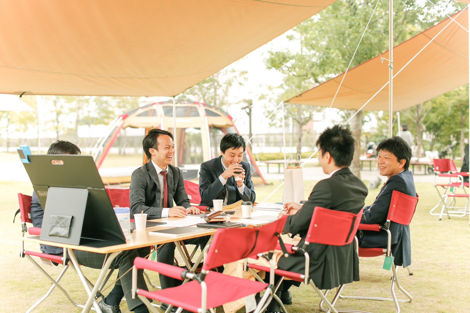 コンセント付のハイカウンターや打合せのできるテント、wi-fi等をご用意しています。