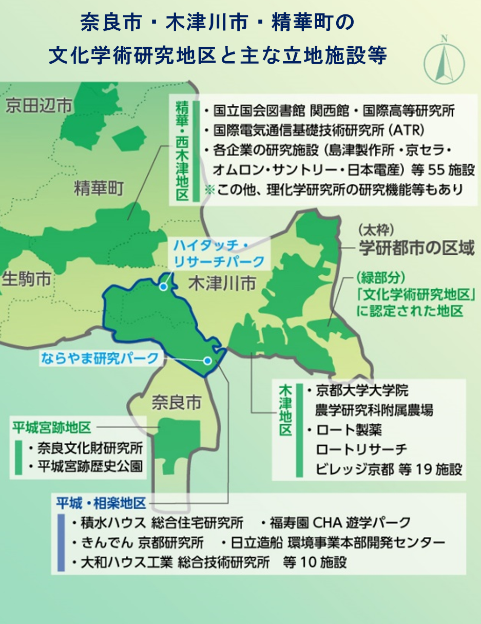 東のつくば(茨城県)と並び、日本を代表するサイエンスシティ「関西文化学術研究都市(けいはんな学研都市)」。京都・大阪・奈良の8市町で構成され、令和4年7月現在で153の研究・大学・文化施設等が立地し、その数は過去20年間で約2倍に増加。現在も伸び続けており、国内外の有力企業から注目されています。つくばが国の主導で国の機関を集約的に配置しているのに対し、けいはんなでは産学官のさまざまな団体が連携し、時代の潮流に合わせて新しいまちづくりを進めています。また、研究施設と住宅地との複合的な開発を進めている点も珍しい特徴です。