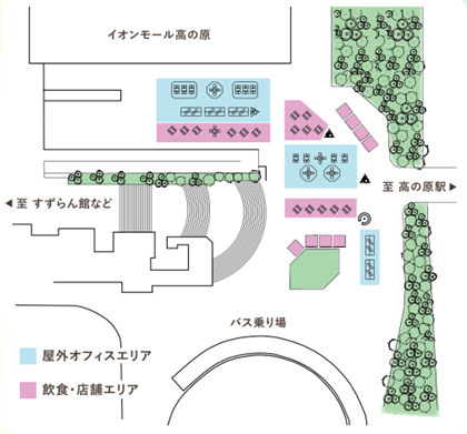 開放的な空間で、緑を感じながら働くことができる、屋外オフィスエリアを、高の原駅前広場に設置します。