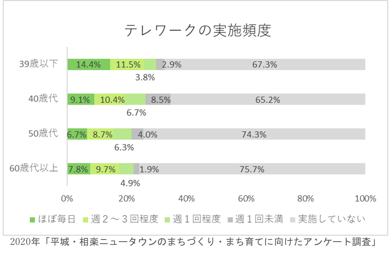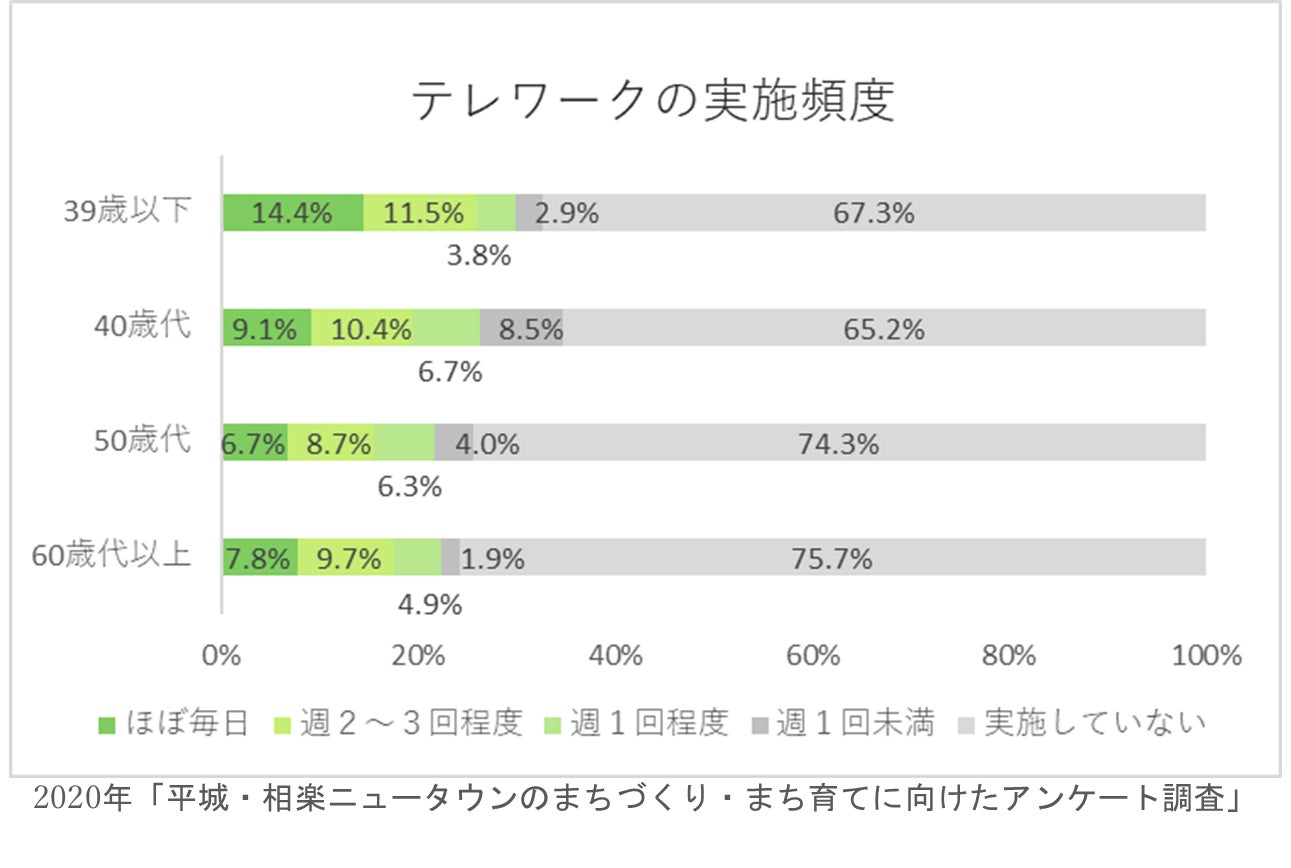コロナ禍の影響により、テレワークを導入する企業が増加しています。2020年に平城・相楽ニュータウンの住民を対象としたアンケートでは、就業している人のうち約22.3%が、週に1回以上のテレワークをしていると回答しています。また、世代が若いほど、テレワークの実施率が高い傾向にあることがわかります。