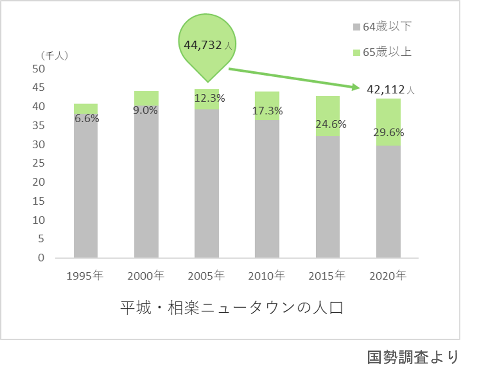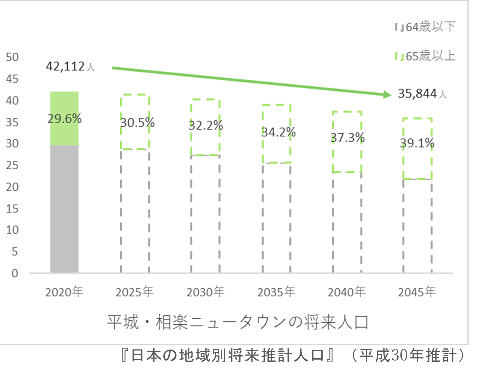 平城・相楽ニュータウンは、段階的な開発により、2005年の44,732人をピークに人口減少傾向が継続しているものの、大幅な人口減少は見られませんでした。一方で、65歳以上の高齢者の人口は増加の一途を辿っています。また、将来推計人口をもとにした試算では、人口減少・高齢化は今後も続き、2020年に29.6%だった高齢者の割合は、2045年には39.1%まで高くなるという予想が出ています。