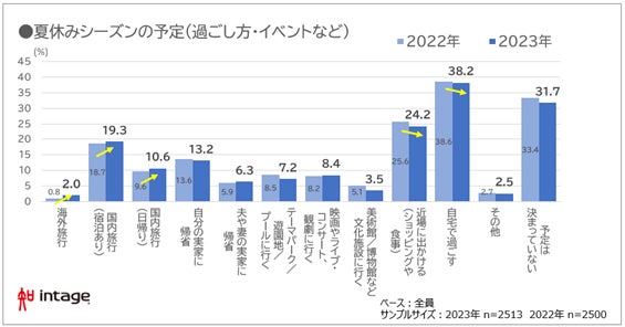 次に、夏休みをどう過ごすかを見てみましょう。複数選択で予定を確認したところ、最も多いのは「自宅で過ごす(38%)」、次いで「近場に出かける(24%)」となりましたがいずれもわずかに減少に転じています。昨年から大きく増えた項目としては「海外旅行(2%)」。渡航先として多く回答があったのはアジア圏、その他アメリカ合衆国やヨーロッパなど遠方渡航者も。「国内旅行(宿泊あり)(19%)」、「国内旅行(日帰り)(11%)」もやや増加し、新型コロナウイルスの5類移行を受け「今年の夏はアクティブに過ごしたい」という層が一定いることが推察されます(図表2)。