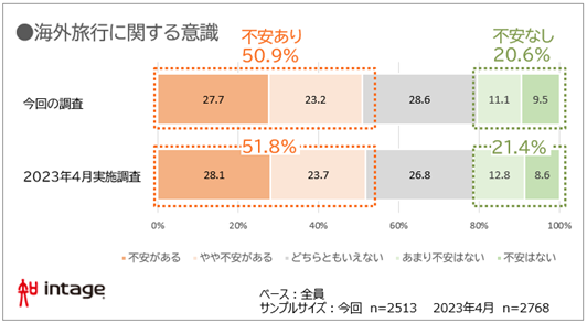 海外旅行については、前年比2.5倍となったものの、コロナ禍前の水準まで戻るかというとやや鈍い印象が否めません。背景には何があるのでしょうか。図表3は、海外旅行に関する意識を全員に聞いた結果です。今回の調査と、4月(5類移行前)に実施した調査を比較すると、ほぼ変動がありません。いずれも「不安がある」「やや不安がある」は合わせて過半数となり、「不安はない」「あまり不安はない」合計数を大きく上回りました。不安が根強く残っていることが分かります。先に示した自由回答から見て取れる費用の問題と併せて、海外旅行への抵抗感が依然ぬぐえない側面があることが、海外旅行回復の足取りを重くさせている要因かもしれません。