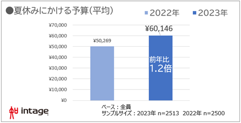 今年の夏休み期間(7月16日~9月30日)にかける予算の総額についてたずねました。平均金額は60,146円と昨年から約1万円の増加(前年比120%)となりました(図表1)。予算が増える理由(自由回答)としては「コロナが5類になり心理的制限がなくなった」「3年間旅行を我慢していたので予算を増やした」などがあがりました。一方で、「ガソリン代や色々な物価上昇のため(やむを得ず増やす)」といった回答も散見され、減る理由として数多くあがった「物価高で旅費を圧縮」「節約のため」とともに、予算が増える人・減る人両方の背景に昨今の物価上昇があることが浮き彫りとなりました。