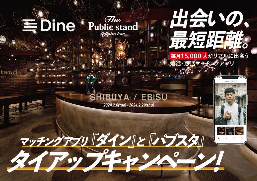 マッチングアプリ「ダイン」とBAR「パブリックスタンド」がタッグを組んで、最短で安心な出会いの提供を開始します。