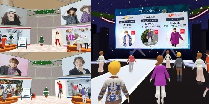 ⼤型スクリーンでライブビューイングが楽しめるスクリーンエリア、4ブランドとQVCの合計5ブースが並ぶブランドエリアを設け、お客さまはアバターとなって空間を回遊し、試着も可能です。すべてをCG化せず、写真を多⽤することで実際の商品をリアルに伝えています。試着の際には3GCD 技術を活⽤して、⾐服の⾊味をより忠実に再現しているほか、⾐服のサイズ感やシルエット感をわかりやすく確認できる360°ビューアも活⽤。商品購⼊時の意思決定を後押しできるように設計しています。アバターの着せ替えやお客さま同⼠でのコミュニケーションも楽しめます。2022年12⽉16⽇(⾦)から12⽉22⽇(⽊)の期間限定での公開です。