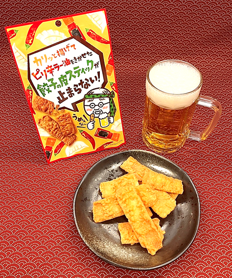 餃子の皮をカリっと揚げた「餃子の皮スティックが止まらない!」を新発売いたします。餃子のタレで定番のラー油味に仕上げており、ピリ辛の味わいがお酒のお供にぴったり。スティックタイプで食べやすいスナックです。