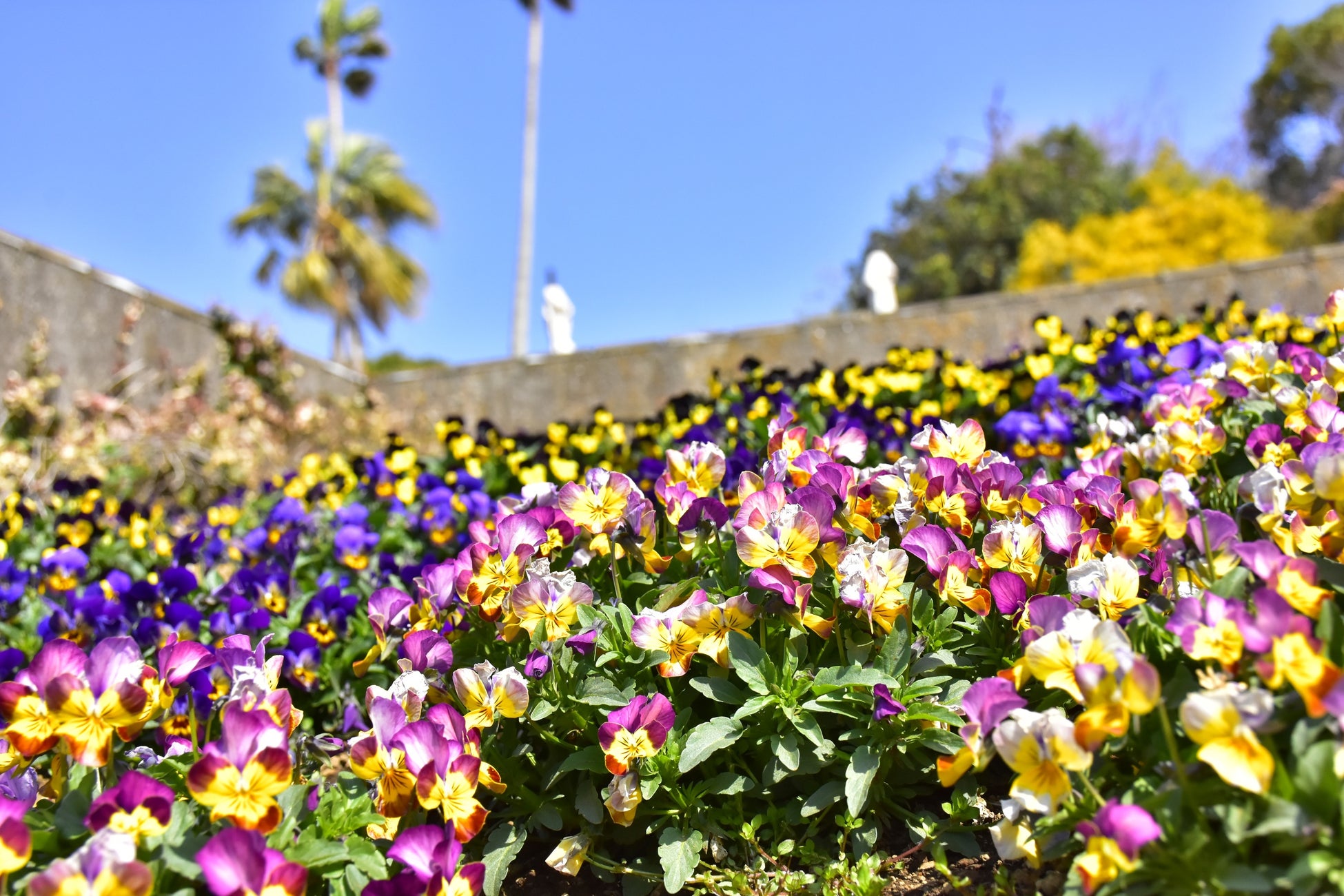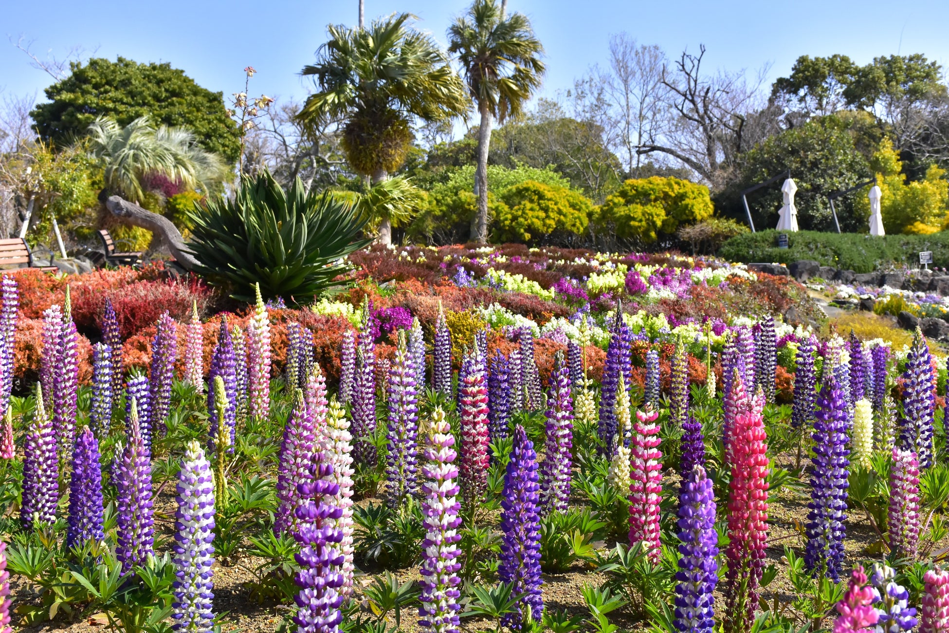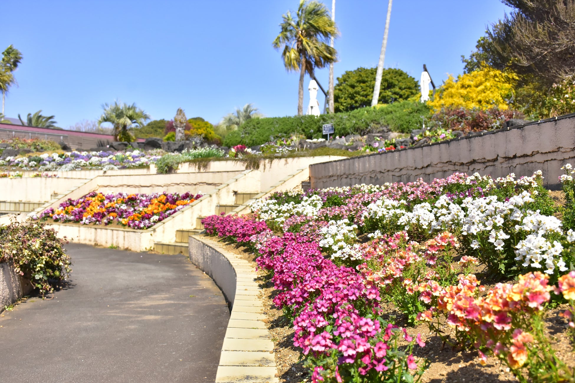 エントランス付近の花壇にはカラフルなリナリアやルピナス、ネメシアなどが、また階段状の花壇では目にも鮮やかなキンギョソウ、ラナンキュラス、パンジーなどが、そのほかにも園内各所で様々な種類の花が咲き、春ならではの光景を楽しむことができます。今後、4月にかけて春深くなる頃には、リナリアが成長して花の絨毯を敷いたように咲き誇り、さらに真っ白なノースポールや、オステオスペルマム、ガザニア、マーガレットなどが見頃を迎え、より一層フラワーガーデンを春色に彩ります。