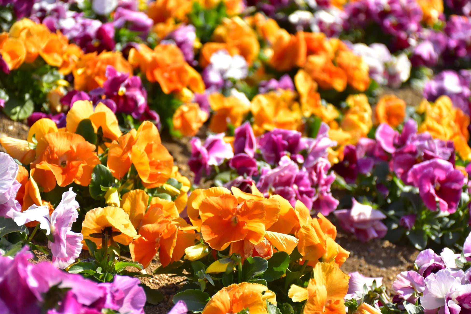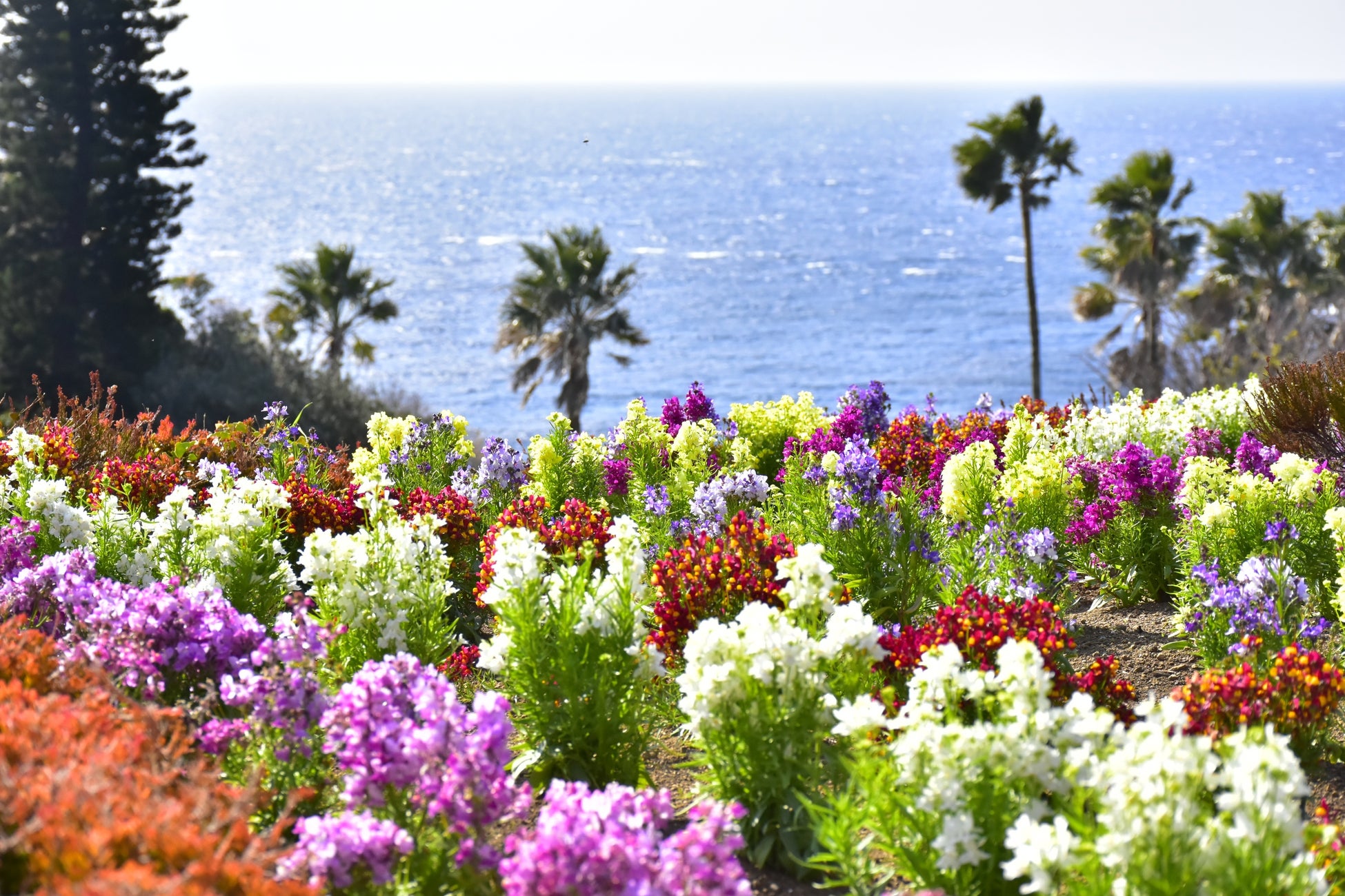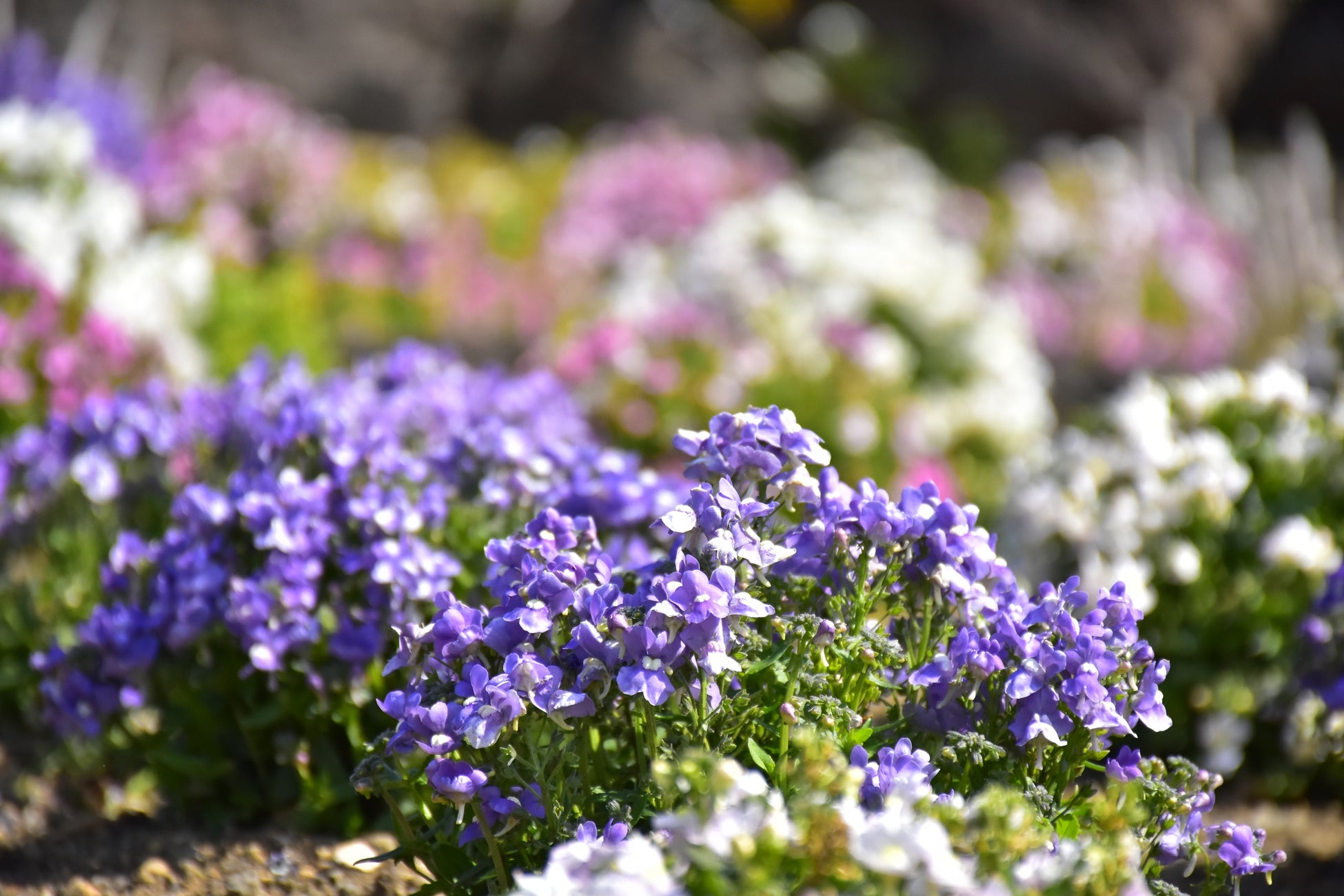 エントランス付近の花壇にはカラフルなリナリアやルピナス、ネメシアなどが、また階段状の花壇では目にも鮮やかなキンギョソウ、ラナンキュラス、パンジーなどが、そのほかにも園内各所で様々な種類の花が咲き、春ならではの光景を楽しむことができます。今後、4月にかけて春深くなる頃には、リナリアが成長して花の絨毯を敷いたように咲き誇り、さらに真っ白なノースポールや、オステオスペルマム、ガザニア、マーガレットなどが見頃を迎え、より一層フラワーガーデンを春色に彩ります。
