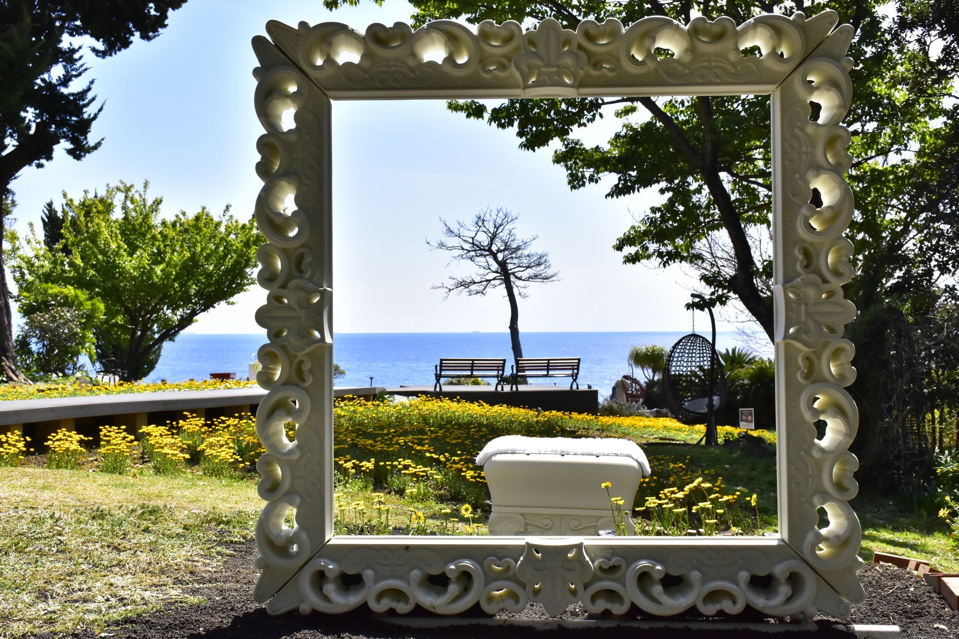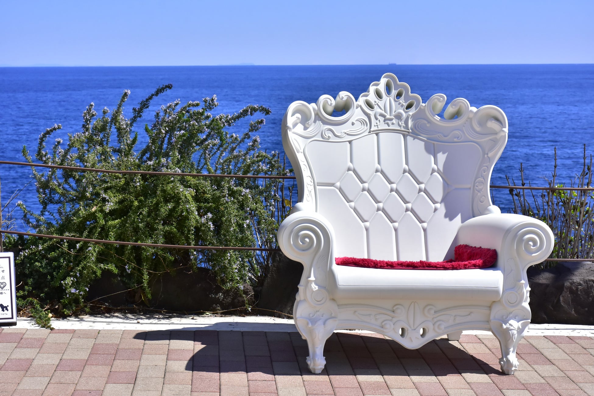 アンティーク&ポップな純白の椅子は、空と海の青色にとてもマッチしています。フォトジェニックな1枚が撮れそうな予感!