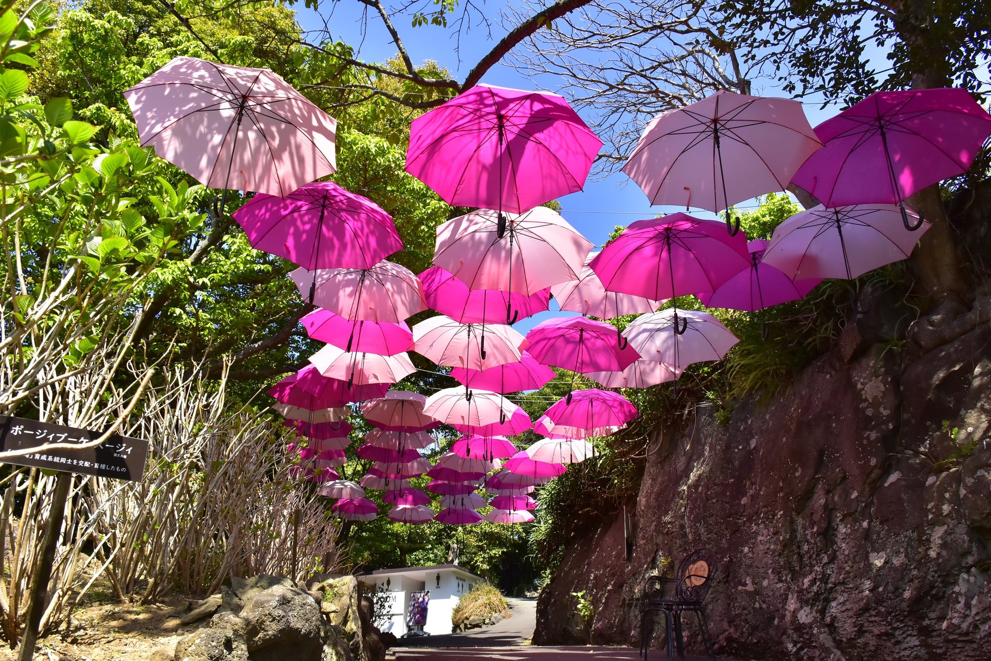 「あじさいロード」の上空に架かる可愛いピンク色のアンブレラ。春の桜をイメージしたアンブレラスカイが登場しました。