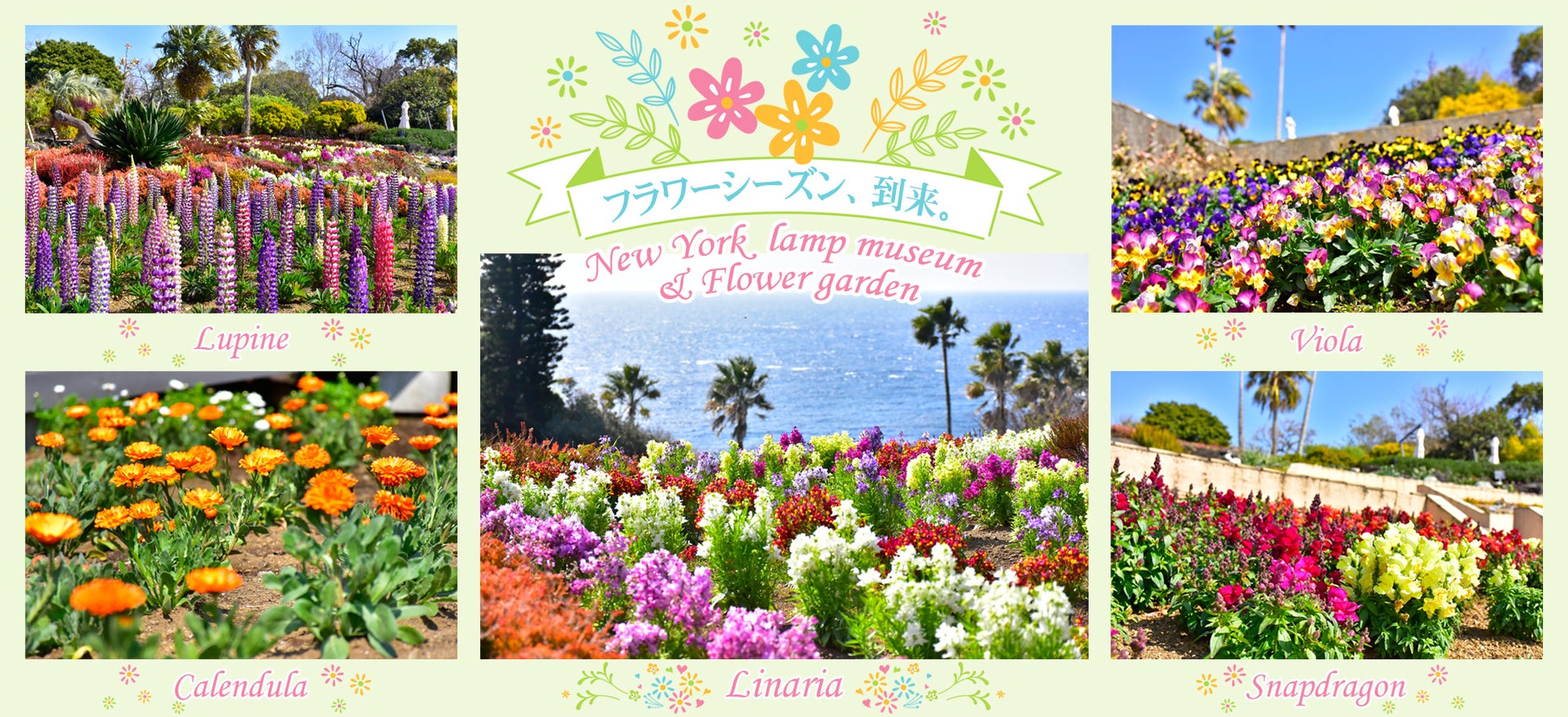 「ニューヨークランプミュージアム&フラワーガーデン」(静岡県伊東市)では、リナリアやルピナスをはじめ、ネメシア、キンギョソウ、パンジー、ビオラなどが見頃となり、青い海を背景に春本番の華やかなフラワーシーズンを迎えています。