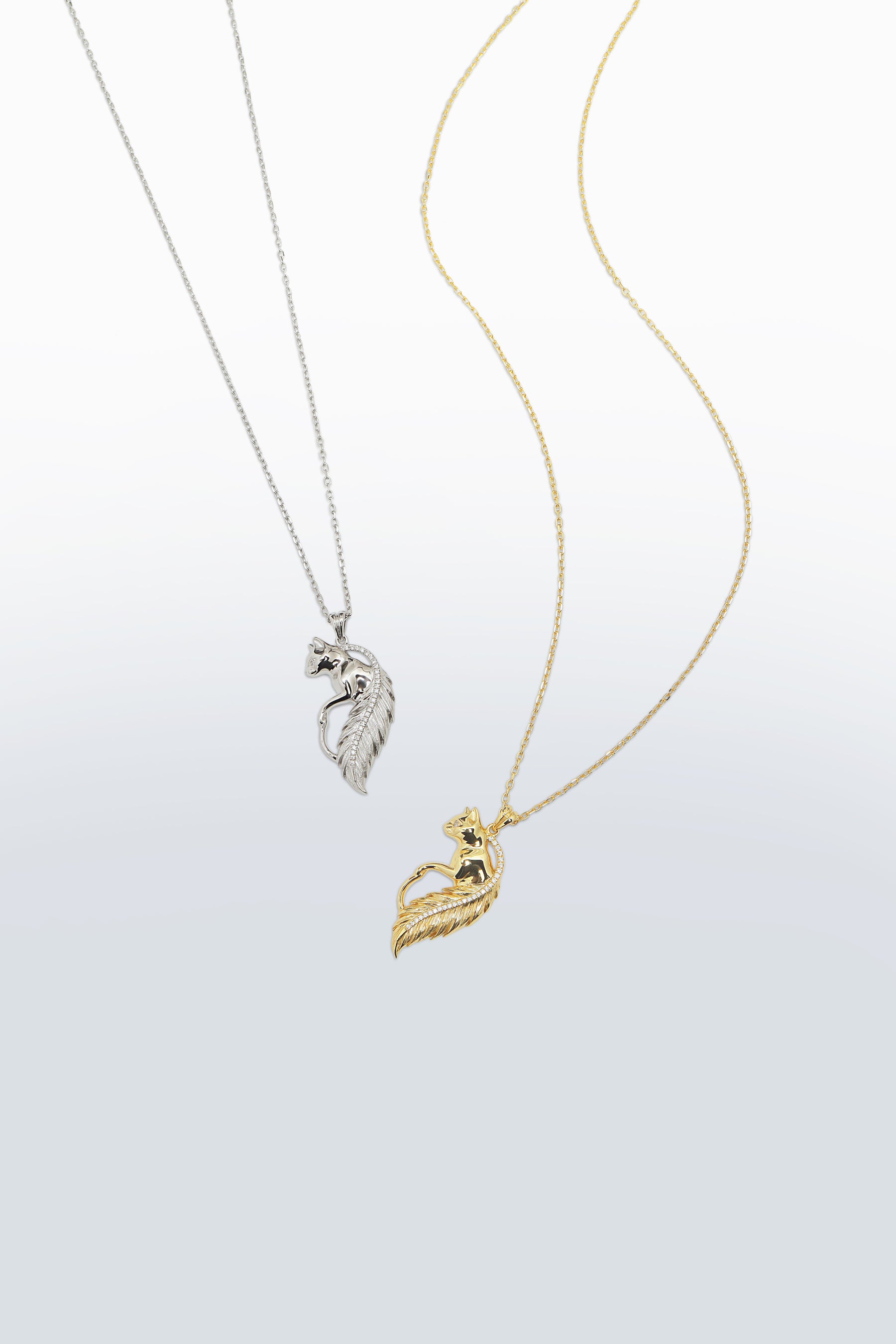 藤原樹が思い描いたイメージをそのまま形にしたトップには、大きな翼を持つ猫をモチーフにした神秘的な造形を採用。身に着けるだけで思わず目を惹く存在感を放ち、このアイテム一つでコーディネートを華やかに彩ります。