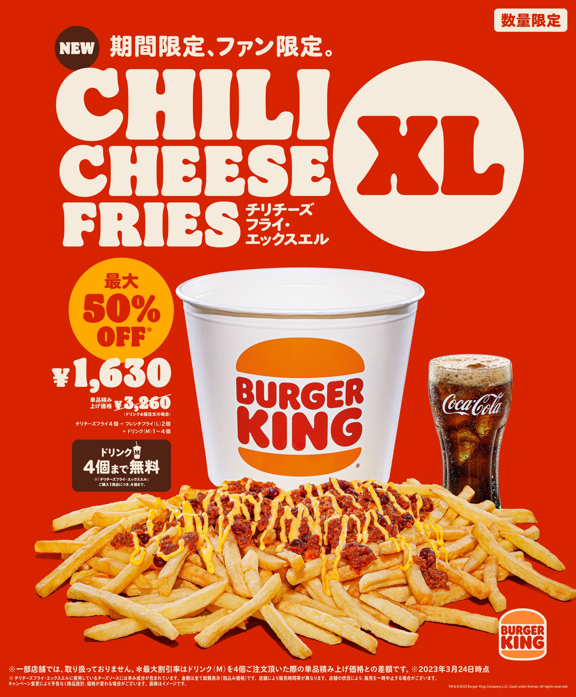 | チリチーズフライファンに朗報! 夢の大容量パックがドリンク付きでお得な最大50%オフ※! 一人でもグループでも楽しめる『チリチーズフライ・エックスエル』新発売! 【期間・数量限定】3月24日(金)~ ※ドリンク最大4個まで無料で追加可能 |