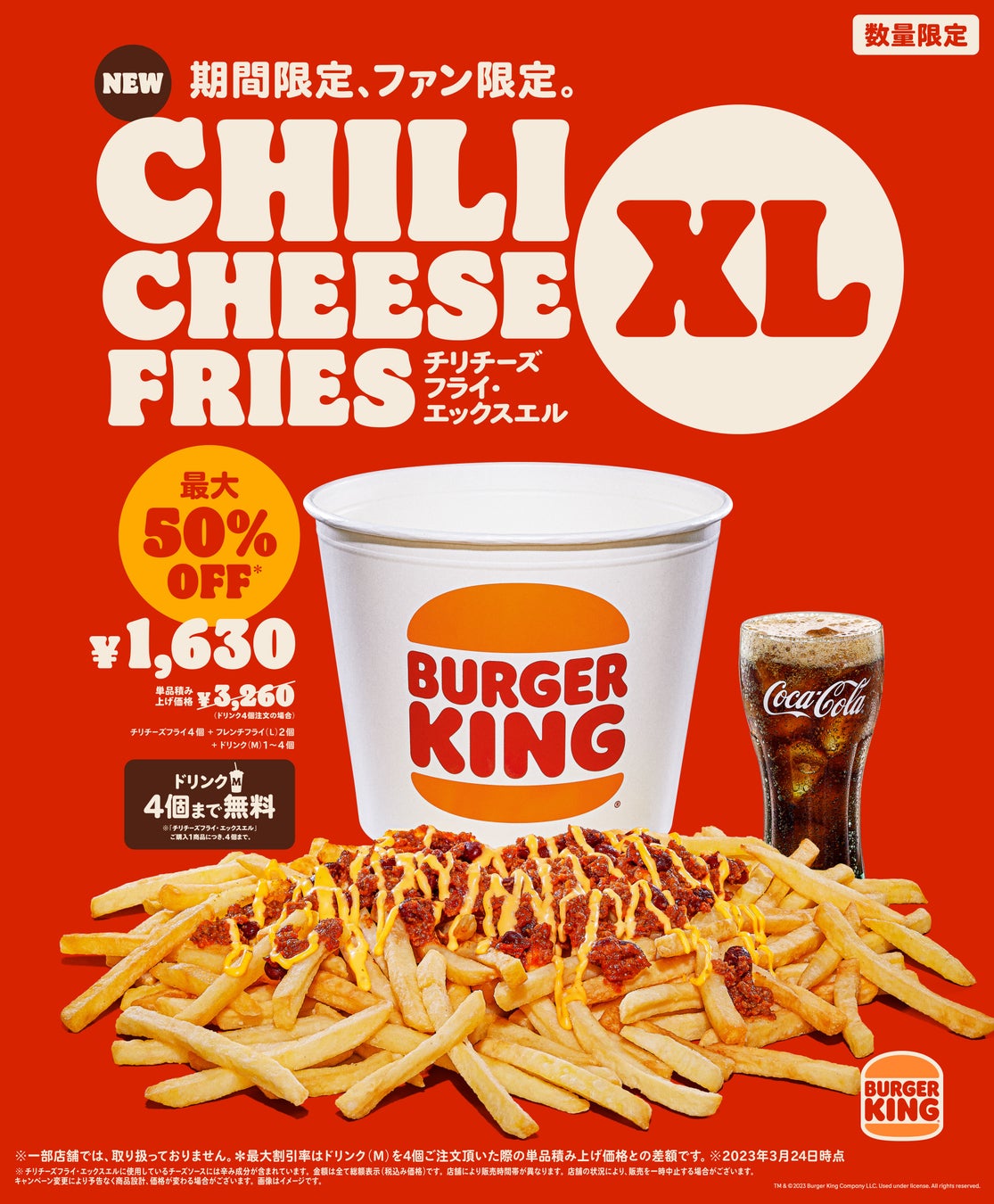 『チリチーズフライ・エックスエル』は、『チリチーズフライ』4個分、『フレンチフライ(L)』2個分を使用した大量の『チリチーズフライ』に、さらにドリンク(M)1~4個が付いた大容量パックです。単品積み上げ価格3,260円※のところ、最大50%オフの1,630円でご提供いたします。ドリンク(M)は、最大4個まで無料で追加可能です。1個から4個までの好きな個数をお選びいただけます。召し上がる人数に合わせてご注文ください。
