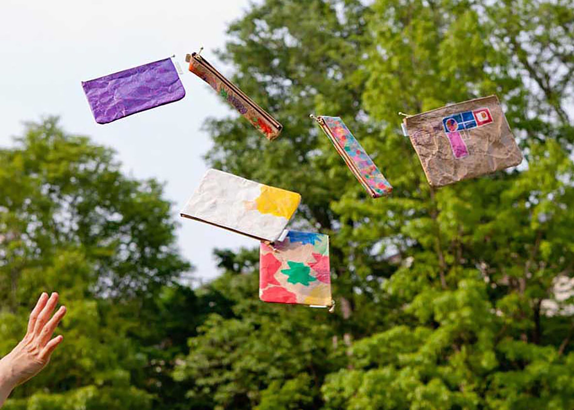 作家が描いた絵を米袋にプリントしたポーチや靴下、仙台で最も古い注染の工場「武田染工場」のコラボレーションで生まれた手拭いなど、お手にとってご覧ください。