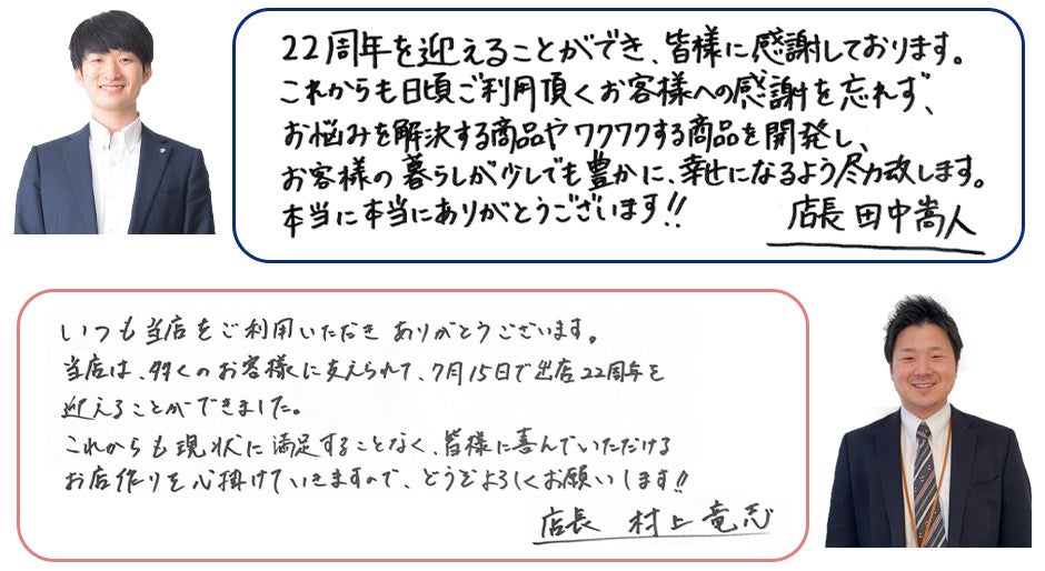 今回のネット出店22周年記念「大感謝祭」開催にあたって、タンスのゲン楽天市場店の店長2人からコメントをいただきました。