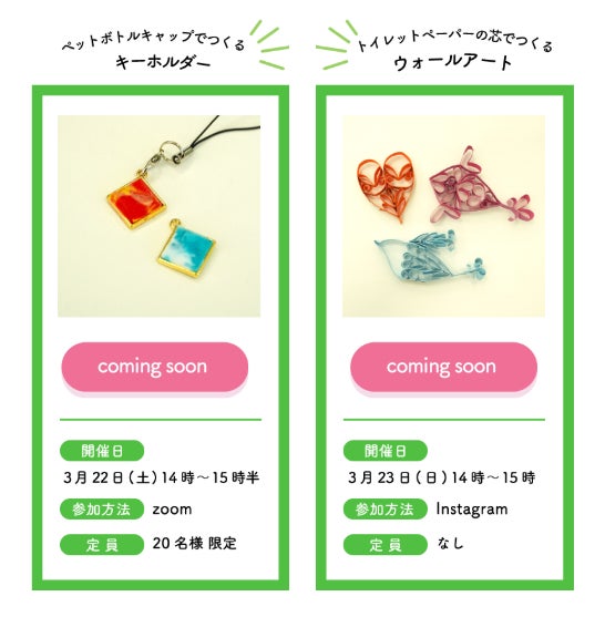 「ペットボトルキャップでつくるキーホルダー」「トイレットペーパーの芯でつくるウォールアート」を予定しています。詳細は決定次第、キャンペーンページにてお知らせします。
