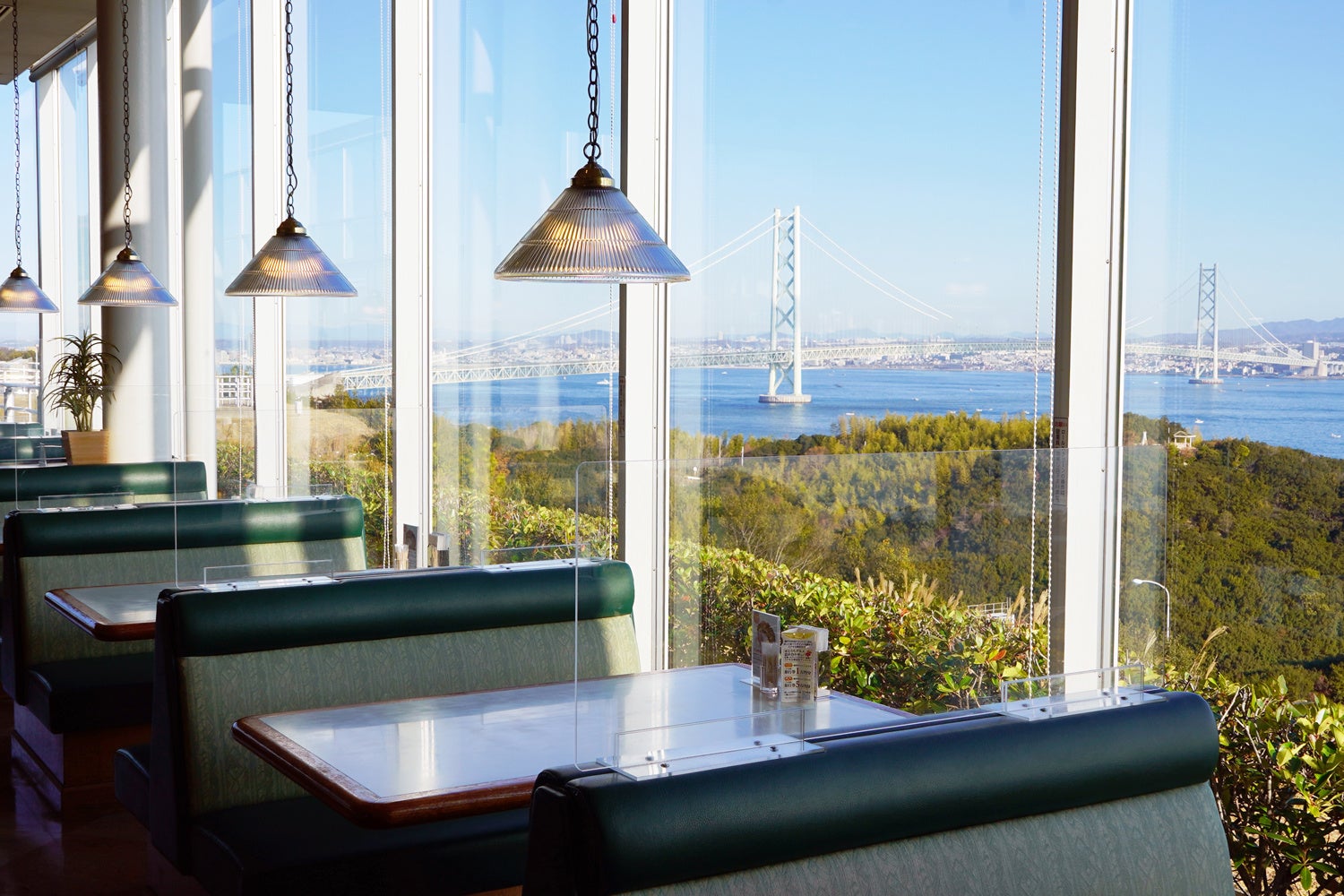 淡路サービスエリア(SA)下り線内「ロイヤル」の広々とした客席からは、雄大な明石海峡の大パノラマが広がります。特に窓際席からの景観は抜群で、まさに絶景が目の前に広がります。