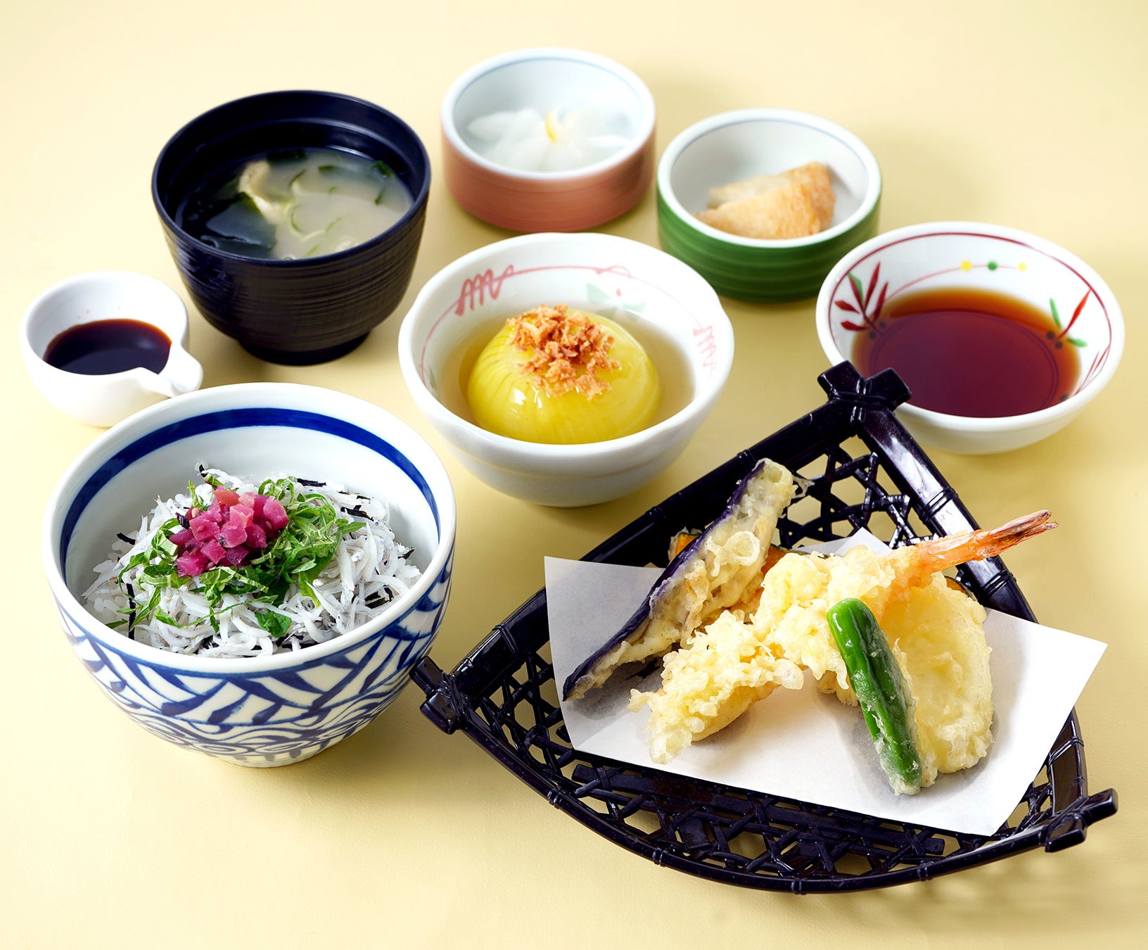 玉ねぎを含む天ぷら盛り合わせ、丸ごと1個玉ねぎの煮物、小皿には、玉ねぎサラダ、更に、しらす丼と味噌汁。勿論「しらす」も淡路島名物。