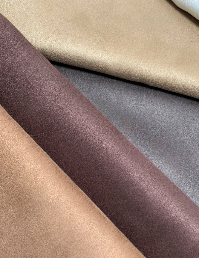 これまでにない弾力性とエアリーで手に吸い付くようなタッチの高級スエード感が特徴の素材です。小松マテーレ独自にスエーディング専用加工設備・薬剤の開発を行い、従来の加工素材と比べてふくらみを出すことに成功しました。