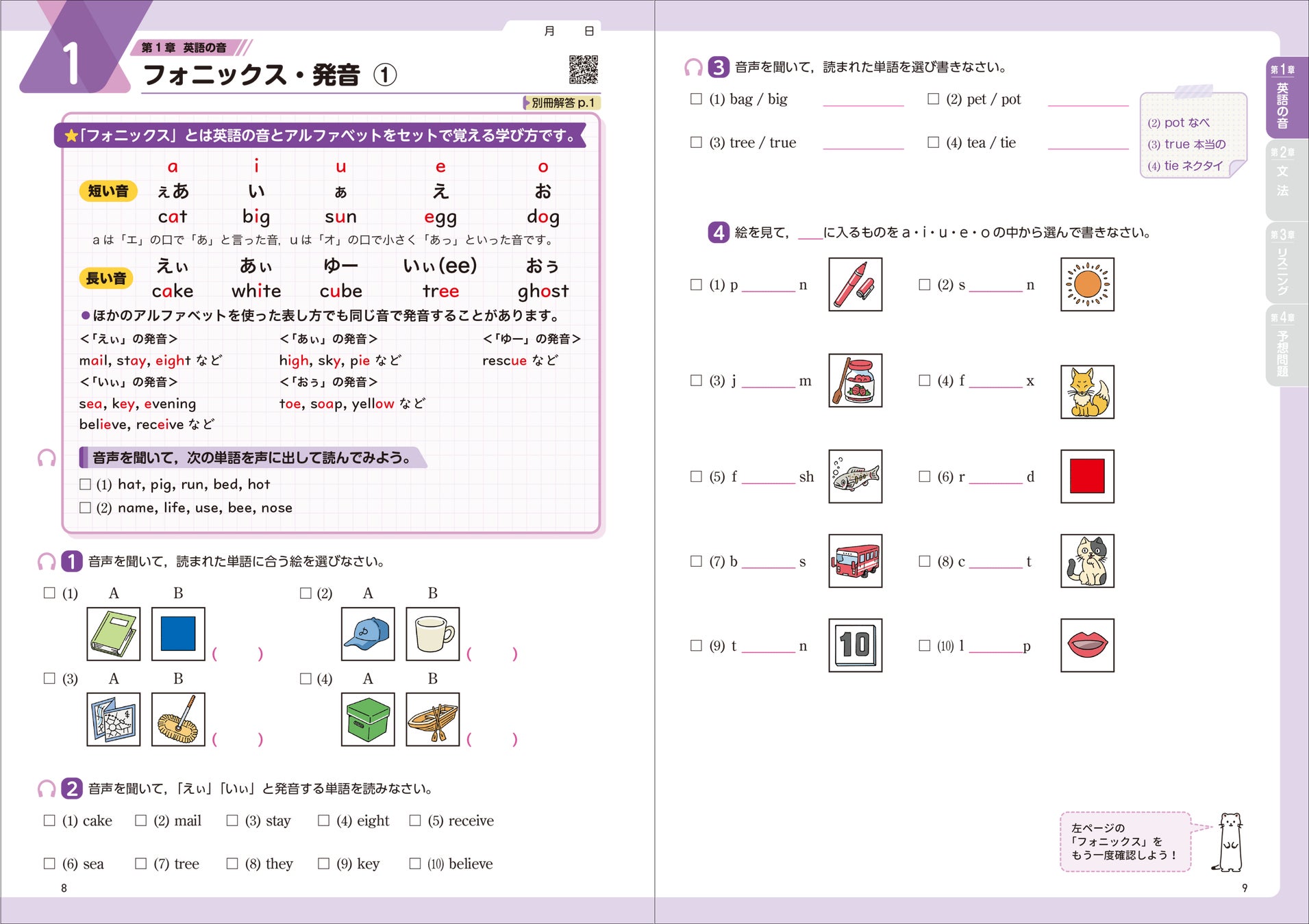 英語を正しく発音するための綴りと音のルールを学ぶ「フォニックス」から学習をスタート。英語を勉強し始めたばかりの人でも取り組みやすい構成です。