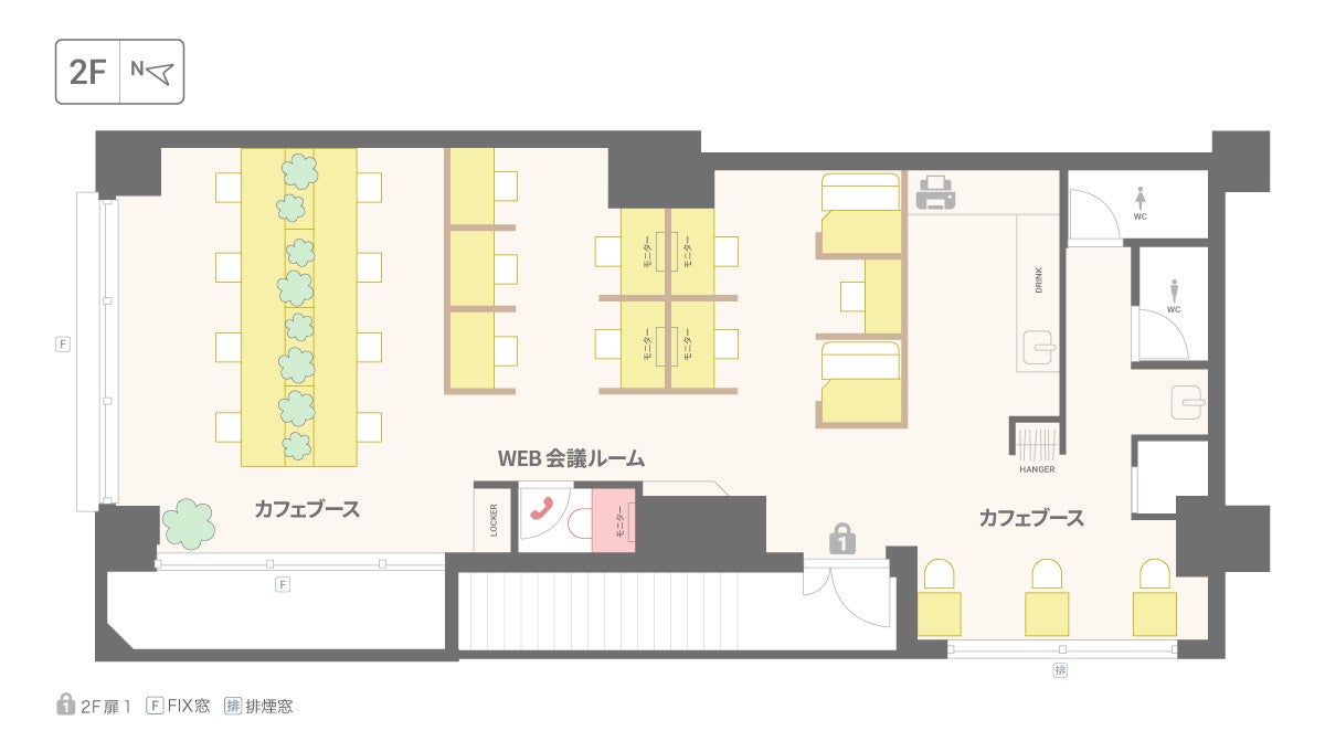 設備:Wi-Fi、フリードリンク、無料プリンター、ロッカー、ポスト、登記可、WEB会議ルーム