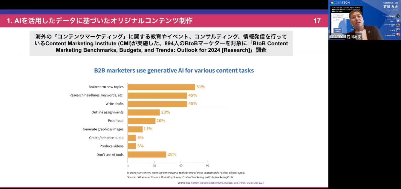 株式会社IDEATECH(本社:東京都港区、代表取締役社長:石川友夫)が、2024年1月15日に開催した「世界のトップ30社SaaS企業が実践するコンテンツマーケティング戦略レポート」と題するオンラインセミナーは、米国企業の最新マーケティング施策や、さまざまなコンテンツマーケティング手法の紹介により、参加者の新たな視点に繋がる有意義なイベントとなりました。