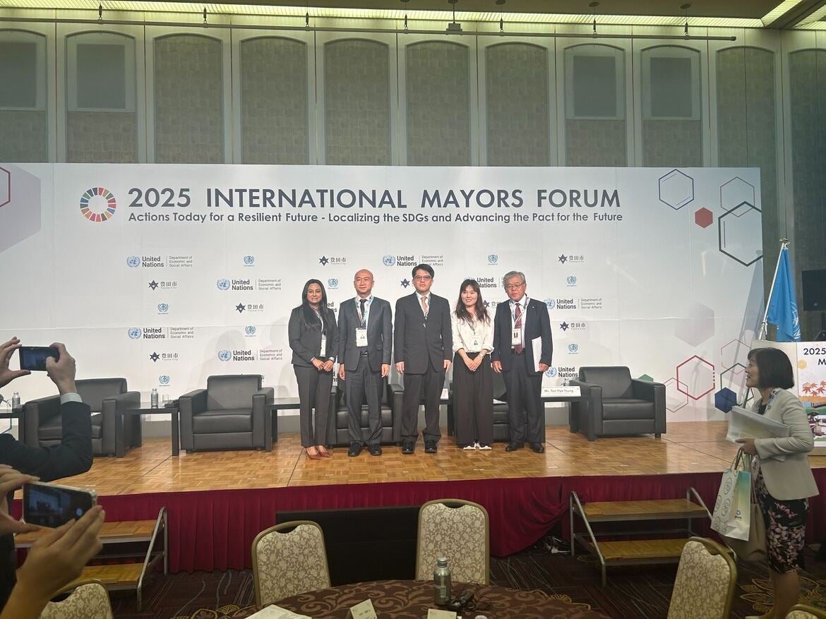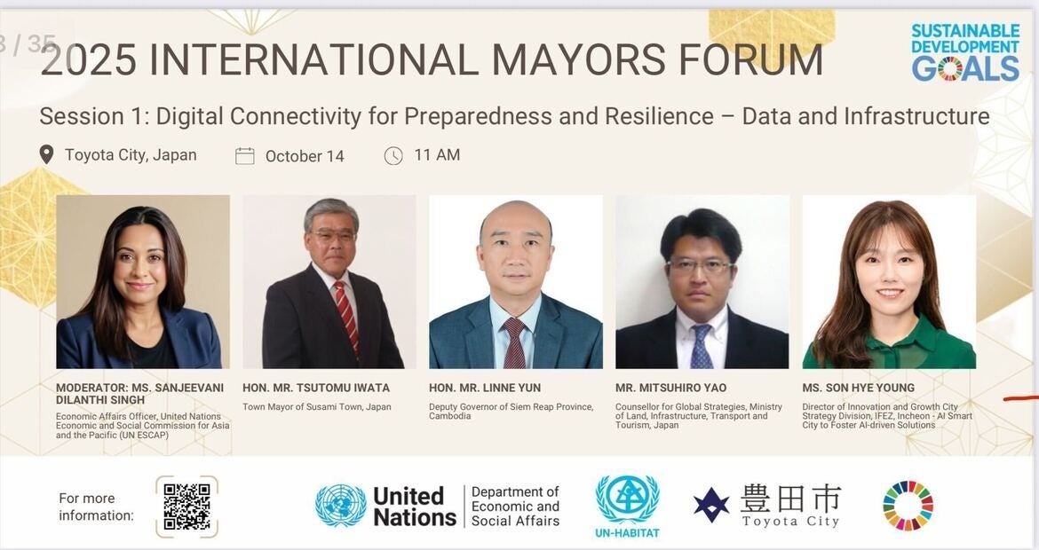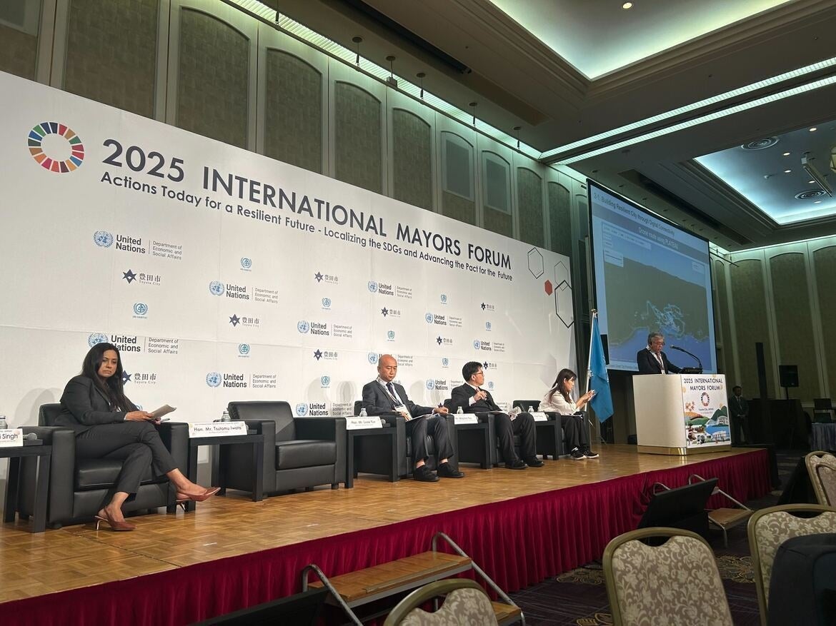「2025 International Mayors Forum」は国連経済社会局(UN DESA)と国連人間居住計画(UN-Habitat)が主催する国際会議で、世界各国の市長や地方自治体代表が集い「Actions Today for a Resilient Future — Localizing the SDGs and Advancing the Pact for the Future」を主題に、持続可能性・レジリエンス(災害対策)に関する政策や事例を共有する場です。今回のセッションでは「Digital Connectivity for Preparedness and Resilience – Data and Infrastructure」が議題の一つとなりました。