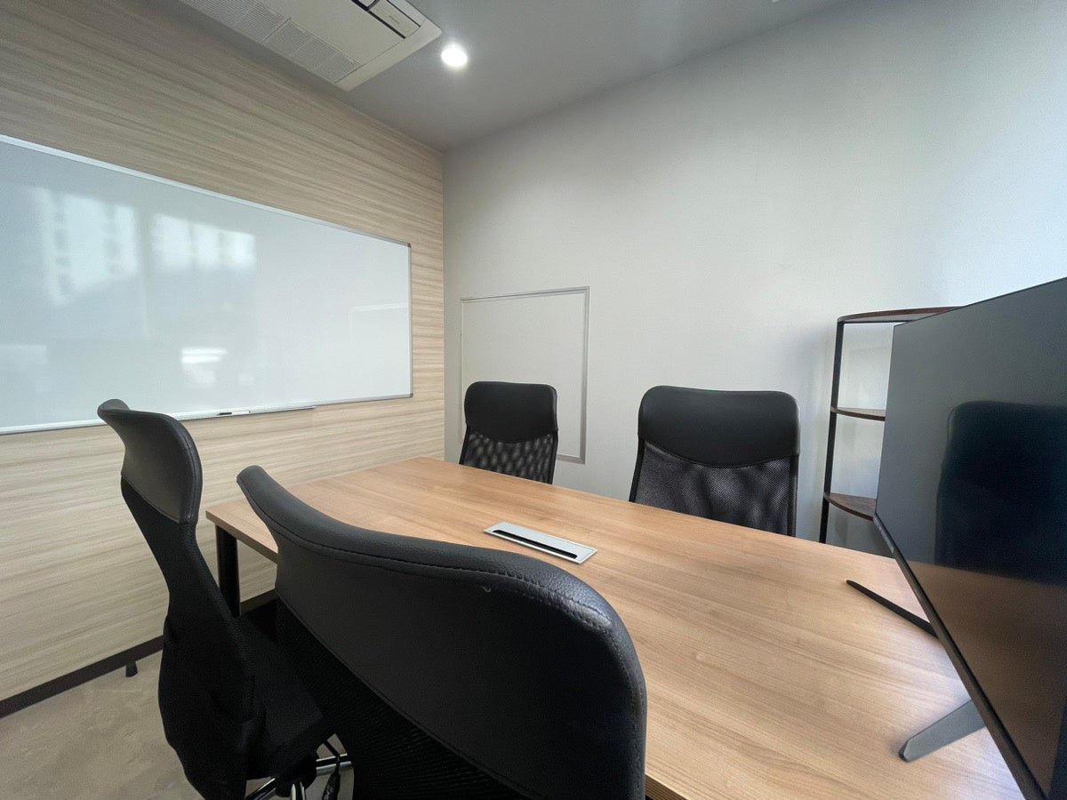 4名用会議室には、32インチの4Kモニターとホワイトボード完備。1時間1,320円という低価格でご利用いただけます。