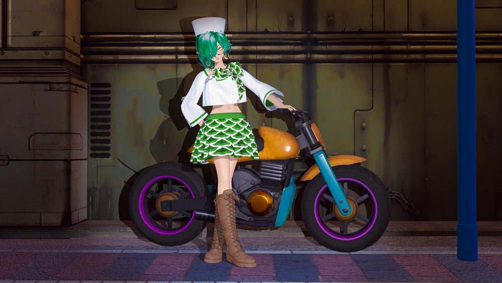 服は3DクリエイターPochi by KT(代表クリエイター:天城翠)のデザイナーである高木恭介氏によるオリジナルデザインです。横須賀が持つ力強い海のイメージに、人魚の神秘的な雰囲気を合わせるようなデザインになっており、トップスには横須賀の海軍をイメージしたセーラー服を大胆アレンジ、スカートとスカーフには青海波柄をあしらい、人魚の鱗を思わせるような細かな光沢を入れてアレンジをしています。錨モチーフのイヤリングは、海と街をつなぐ“絆”をイメージしてポイントに。全体をセーラーラインでまとめつつ、やわらかさの中に少しだけ強さを残したデザインになっています。