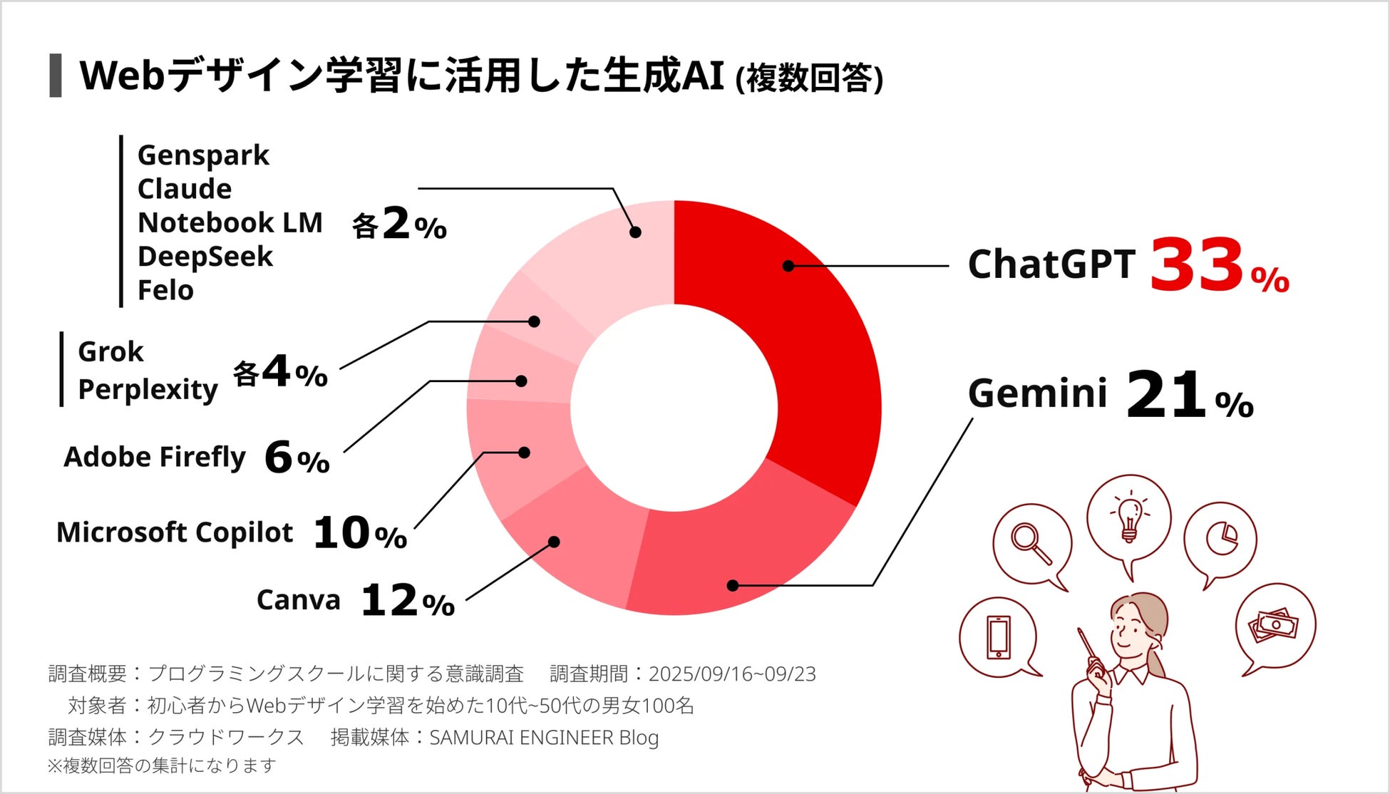 最後に「Webデザイン学習に活用した生成AI」を聞いたところ「ChatGPT」が33%と最も多く、次いで21%が「Gemini」、12%が「Canva」10%、が「Microsoft Copilot」、6%が「Adobe Firefly」、4%が「Grok」「Perplexity」、2%が「Genspark」「Claude」「Notebook LM」「DeepSeek」「Felo」と回答しました。