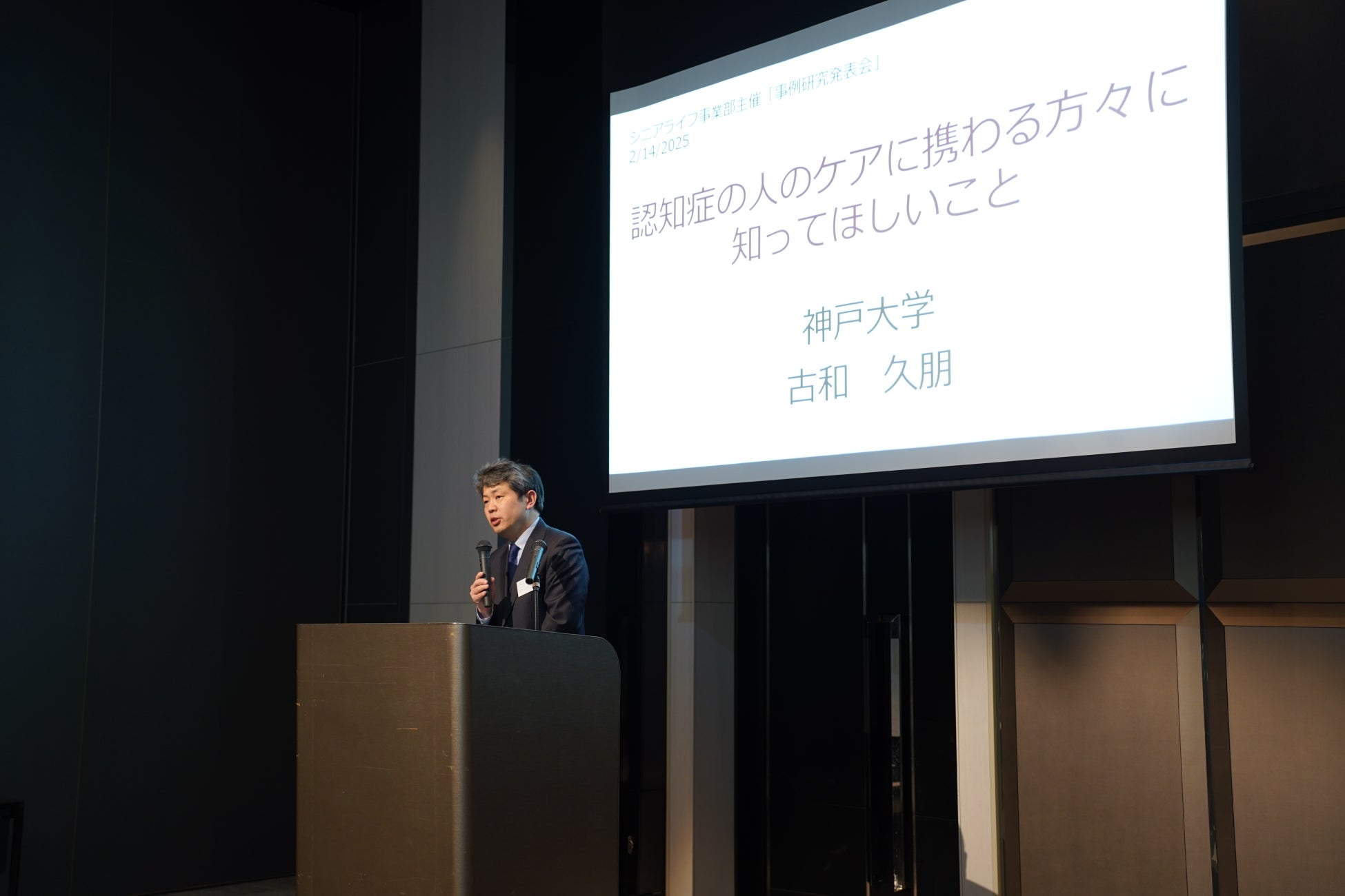 事例研究発表会に先立ち、神戸大学大学院保健学研究科教授で同認知症予防推進センター センター長の古和久朋医師による特別講演「認知症の人のケアに携わる方々に知ってほしいこと」が行われました。講演では、認知症ケアに携わる人々が持つべき基本的な心構えと知識、具体的なケアの実践方法について、詳細な解説がありました。