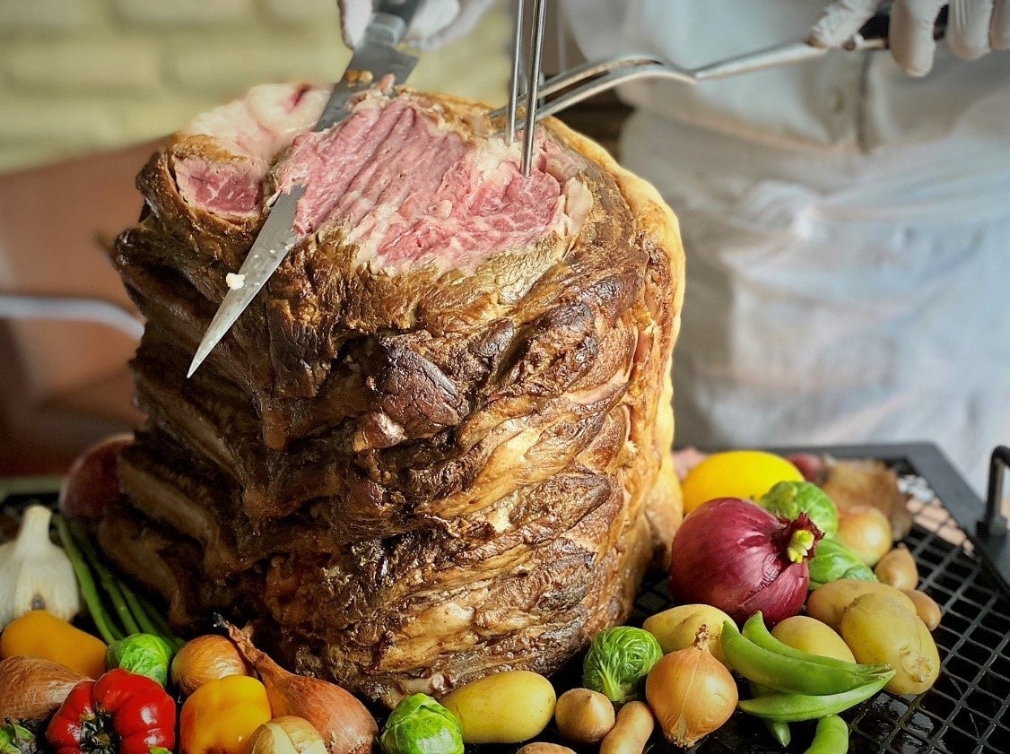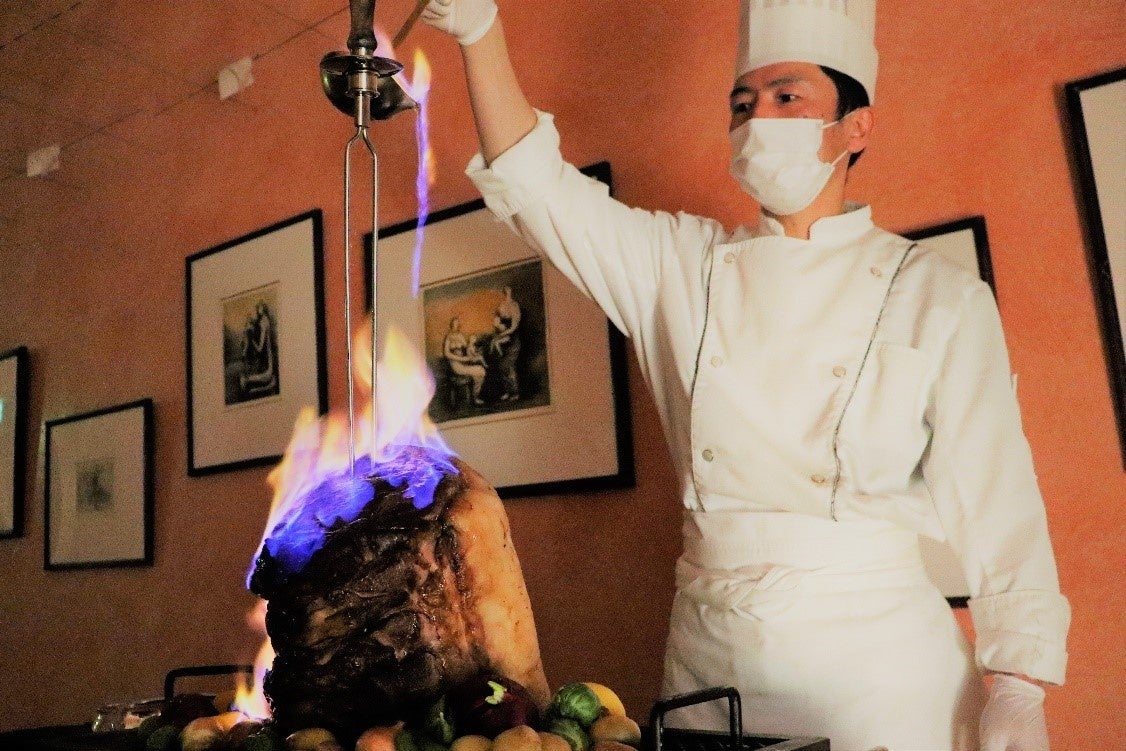 この度のホテル川久「王様のシュラスコ」では、10kgの知多牛リブロースをじっくりと時間をかけてローストし、焼き上がったものをレストラン会場内にお披露目。最後の仕上げに、熟練のシェフがお客様の目の前で塊肉を豪快にフランベ。迫力満点のパフォーマンスで圧巻の空間を演出いたします。