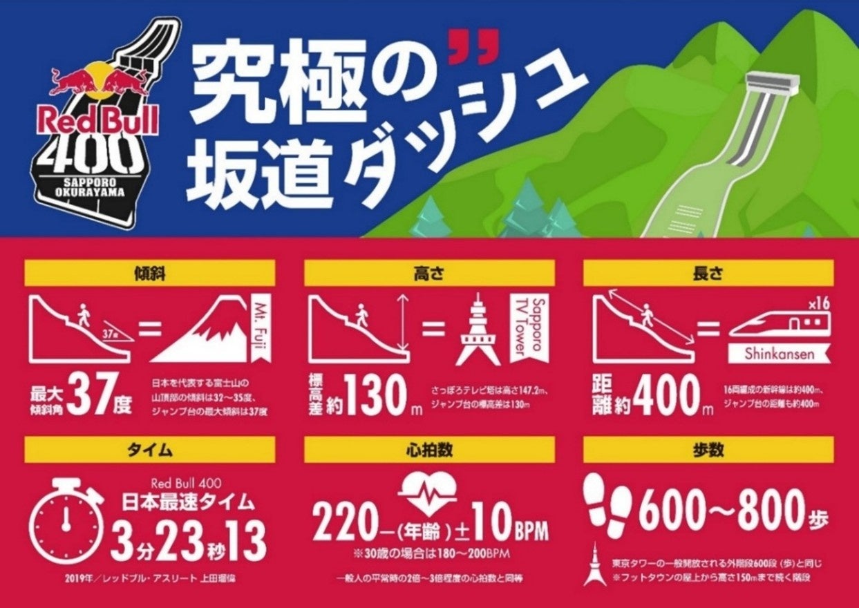 「Red Bull 400」は、世界で最も過酷と言われる坂道ダッシュレースです。2011 年にオーストリアで初めて開催され、日本では 2017 年を皮切りに今年で 8 回目の開催となります。毎年全国各地から参加者が集い、これまでに延べ 約9.000人以上がこの過酷なレースに挑戦してきました。最高斜度は富士山の山頂付近の傾斜(32 度〜35 度)を超える 37 度、高低差は札幌市のシンボル「さっぽろテレビ塔」に匹敵する約130m に及び、心拍数は平常時の約 2 倍〜3 倍まで上がると言われています。